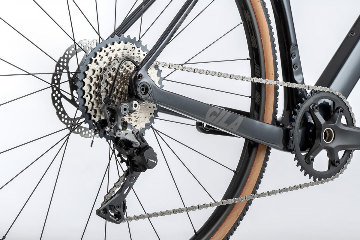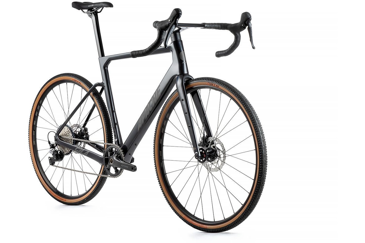 Gravel Apache Gila 5?je postavena na karbonov?m r?mu a vidlici. D?le je vybavena pohonem Shimano GRX 1x11, kotoučov?mi brzdami a koly o průměru 28 palců..