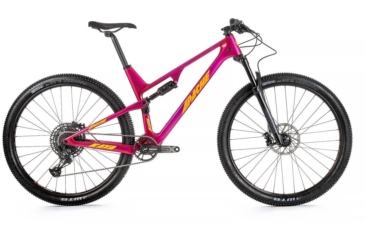 Apache Kaya C3 je celoodpružen? horsk? kolo s karbonov?m r?mem, koly o průměru 29 palců, odpruženou vzduchovou vidlic? a tlumičem, kotoučov?mi brzdami a pohonem 1x12.