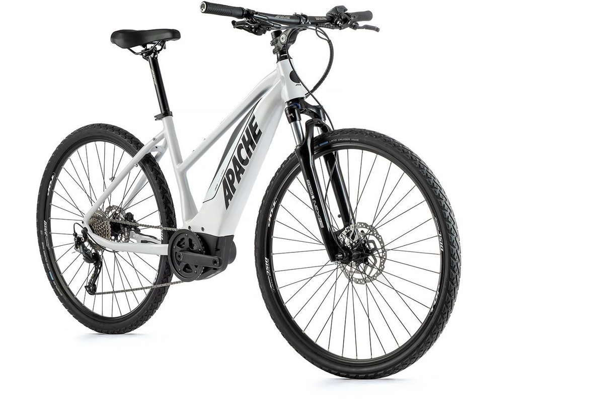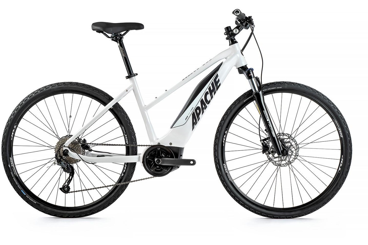 Apache Matta 3 Bosch?je d?msk? krosov? elektrokolo s hlin?kov?m r?mem, kter? je vybaveno středov?m motorem Bosch Active Line Gen. 3, bateri? o kapacitě 500 Wh, pohonem Shimano 1x9, odpruženou vidlic? a koly o průměru 28 palců.