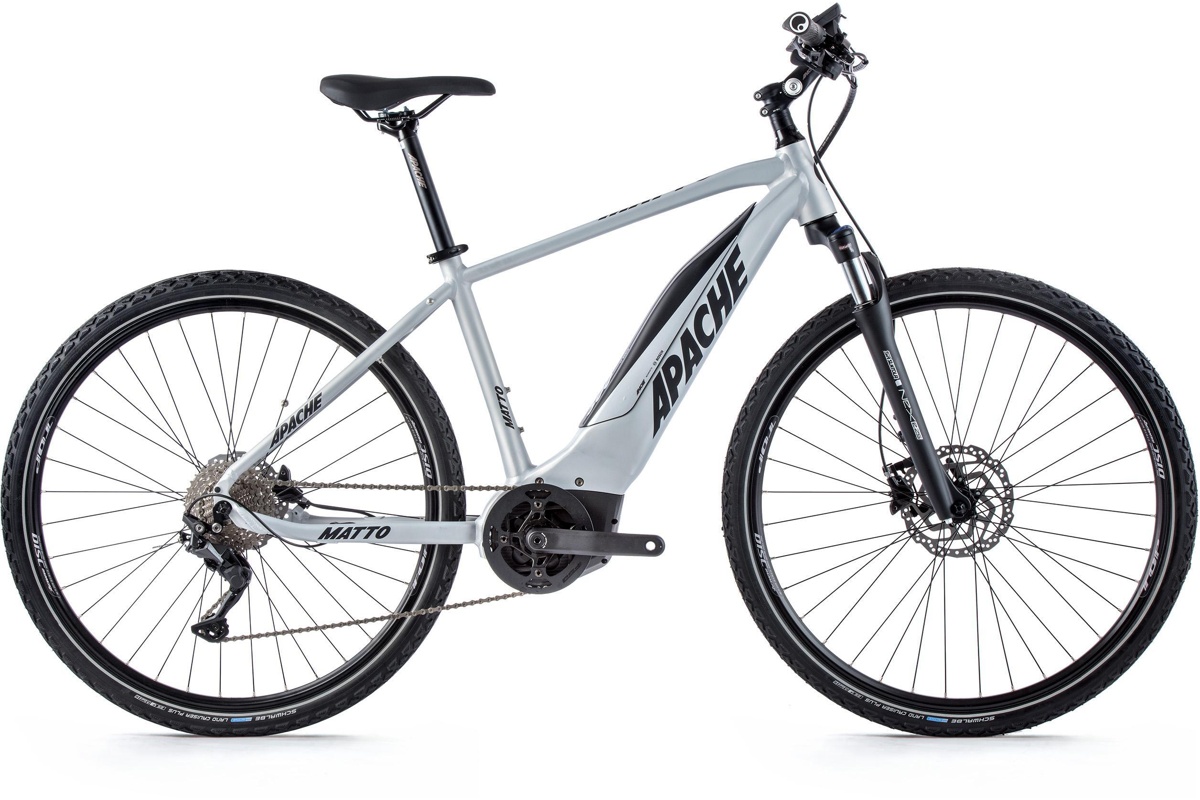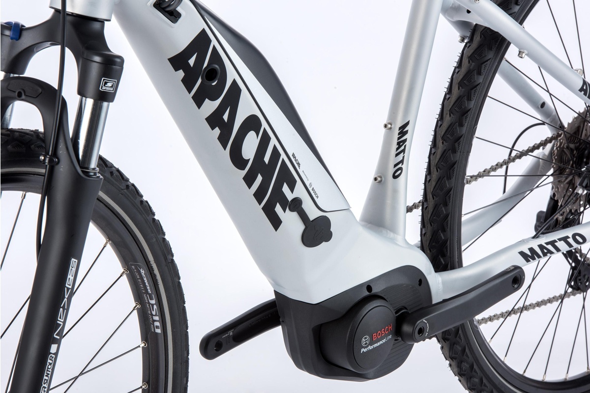 Apache Matto Bosch je krosov? elektrokolo s hlin?kov?m r?mem, kter? je vybaveno středov?m motorem Bosch PF Line Gen. 3, bateri? o kapacitě 500 Wh, pohonem Shimano 1x10, odpruženou vidlic? a koly o průměru 28 palců.