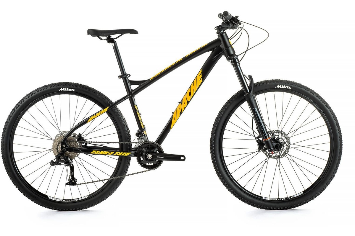 Apache Tanka Tate A3 je horsk? kolo s hlinikov?m r?mem, koly o průměru 27,5 palce, odpruženou vzduchovou vidlic? a pohonem 2x9.