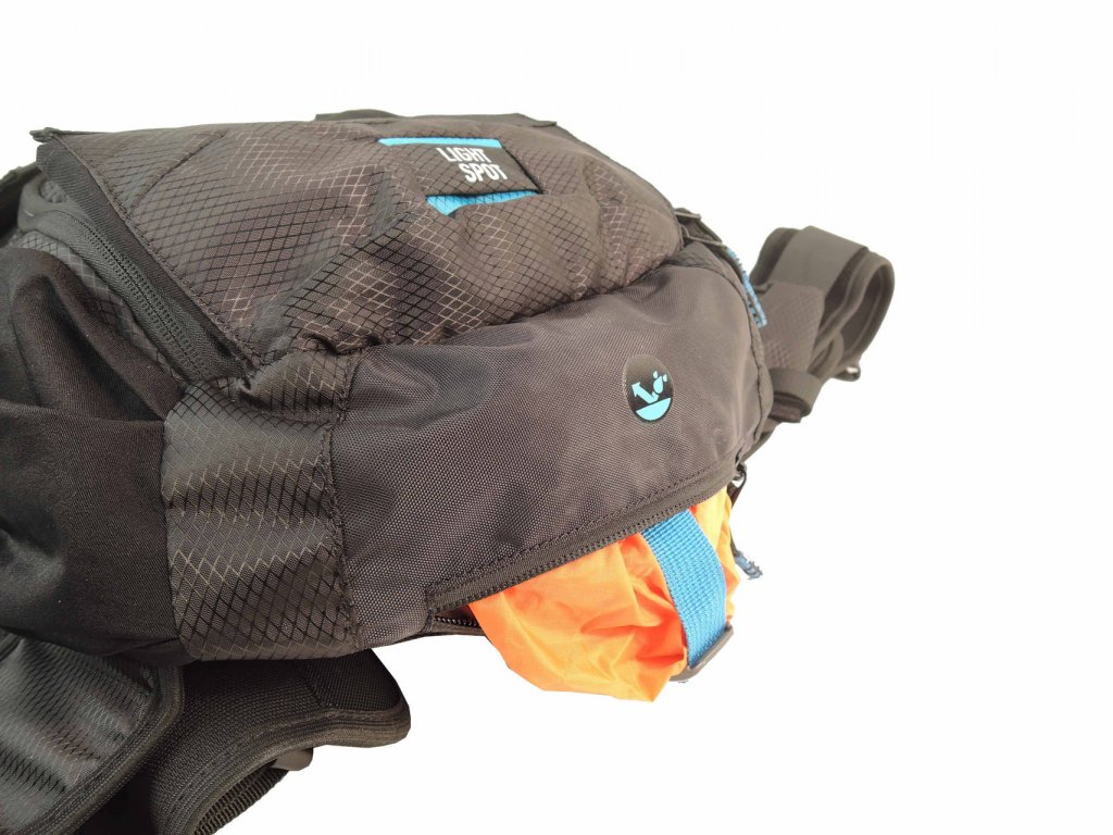 Další vychytávky batohu: kapsa a poutko na vodní rezervoár, integrovaná pláštěnka ve svítivě oranžové barvě s velkým reflexním logem, systém uchycení přilby k batohu (lze také upevnit integrálku).