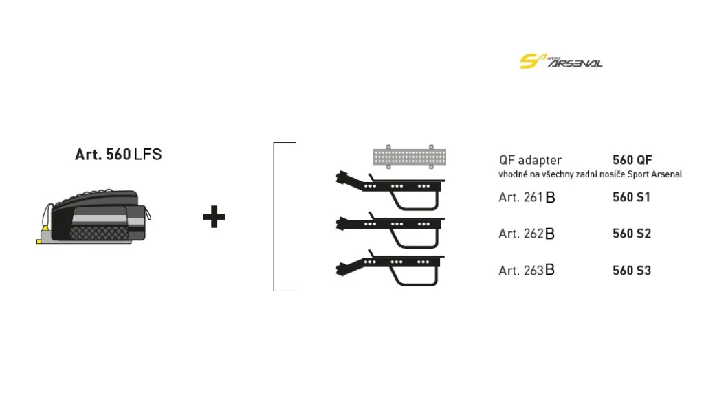 Na klasické zadní nosiče Sport Arsenal nebo přední nosič art.203 Sport Arsenal lze tuto brašnu použít po přidání adaptéru Art.185 QF . Originální QuickFix systém přináší jednoduché, rychlé a spolehlivé uchycení brašny k nosiči.