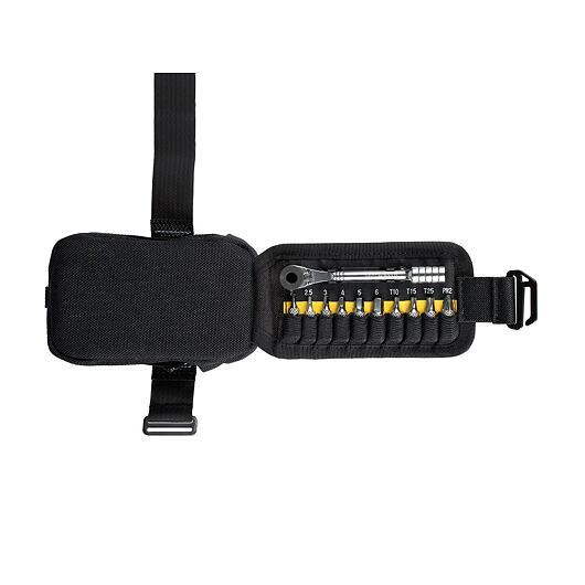 Brašna GearBag navíc přináší skrytou přihrádku na nářadí, která odděluje nářadí a osobní věci pro lepší organizaci. Obsahuje nářadí s ráčnou a 10 bity, takže je zajištěno, že si při jízdě na kole nezapomenete nářadí.