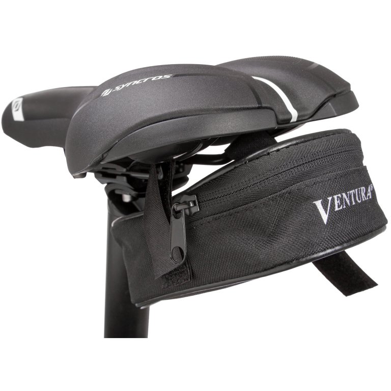 Podsedlová brašna se suchými zipy Upevnění: 2 suché zipy, upevnění na vzpěry sedla Materiál: voděodolný polyester Reflexní nápis Rozměry (d x š x v): 140 x 85 x 50 mm Barva: černá Balení: karta Ventura