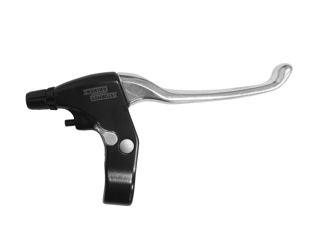 Pravá brzdová páka Sturmey-Archer vhodná také pro bubnové brzdy. Páka má aretační / parkovací tlačítko. Určená pro 4 prsty. Hmotnost: 126 g Materiál: hliník Barva: stříbrno/černá
