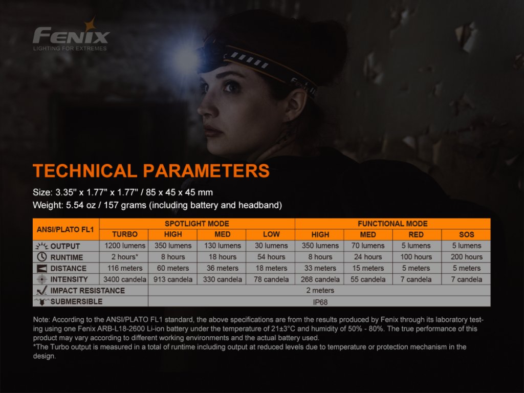 Všechny parametry svítilny (světelný tok, doba provozu na baterie, vodotěsnost, dosvit a nárazuvzdornost) jsou změřeny v souladu s normou ANSI/NEMA FL 1-2009.