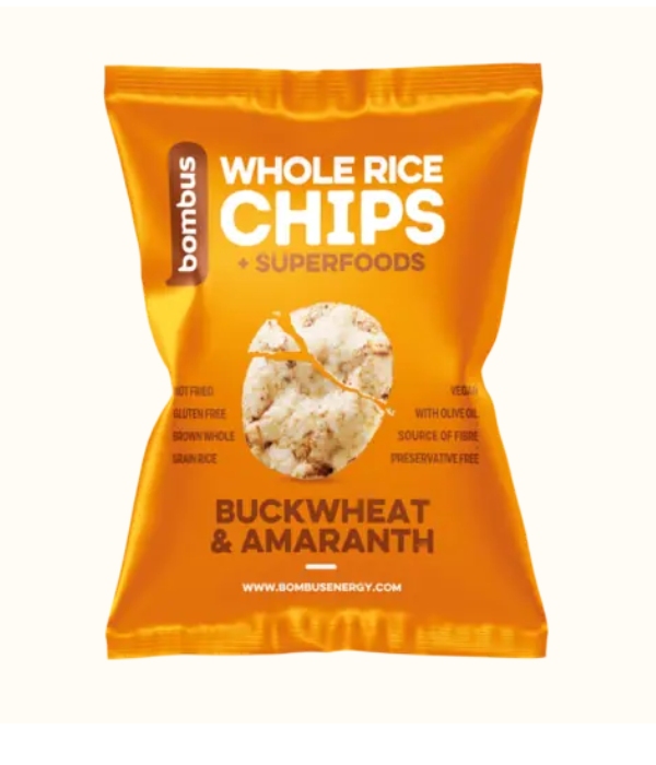 Složení: chipsy 83% (hnědá celozrnná rýže 80%, pohanka 17%, amaranth 3%), olivový olej 16%, sůl 1%.