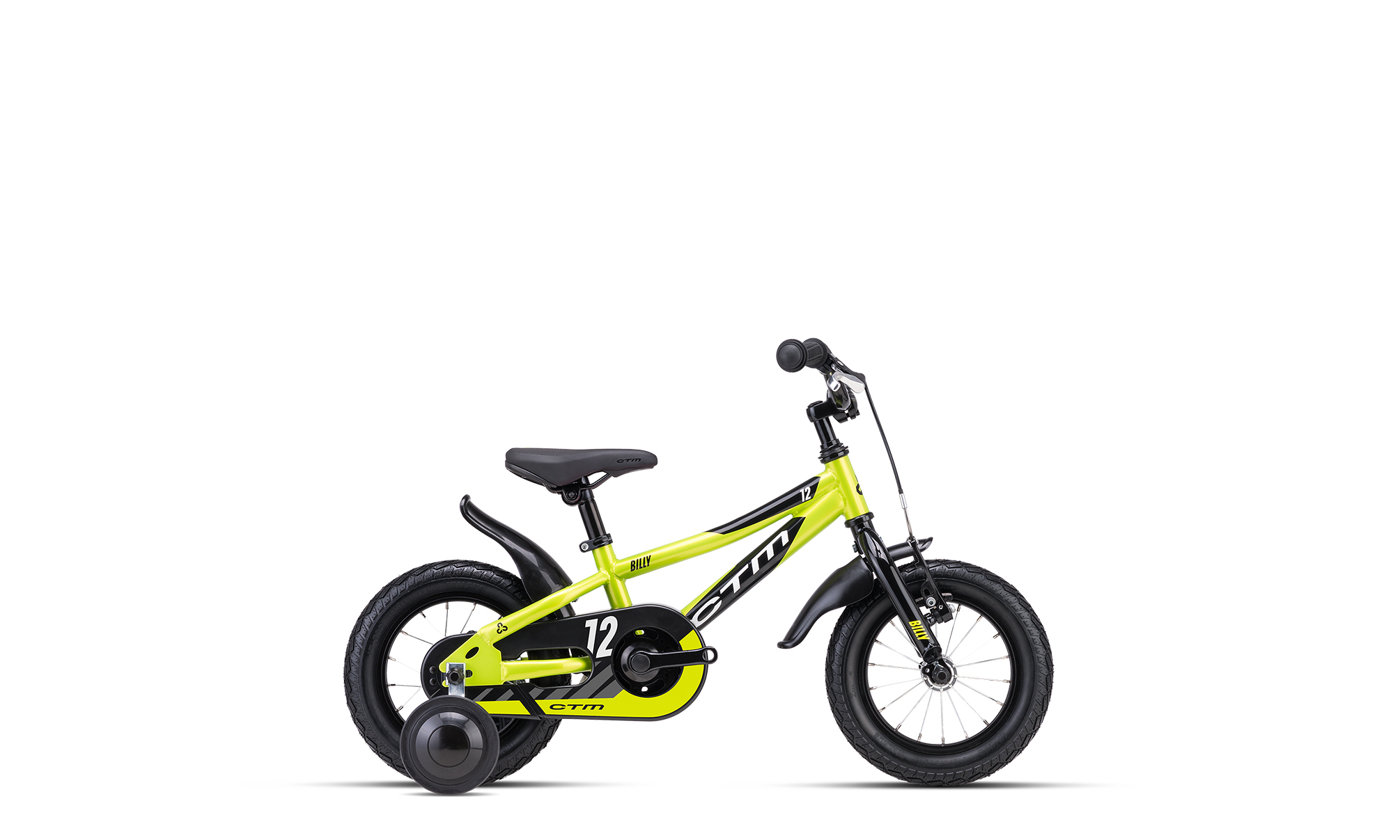 Jízdní kolo CTM BILLY 2025 limetková perleť / černá. Kolo je vybaveno rámem BILLY, Hi-Ten, 6,5 a vidlicí Hi Ten-unicrown 12".