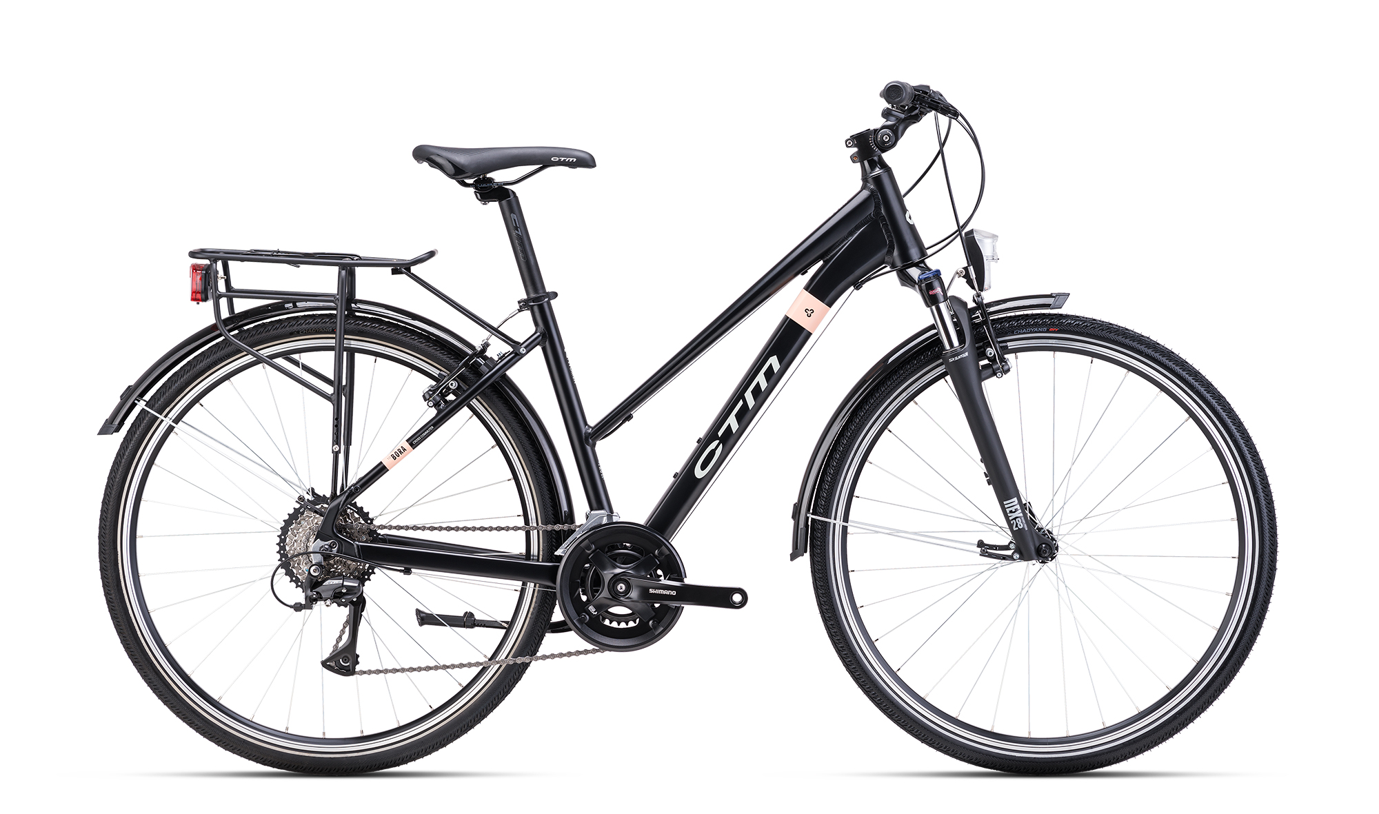 Jízdní kolo CTM BORA 1.0 trek 2025 matná černá / pastelová oranžová. Kolo je vybaveno rámem ALU 6061, M, L a vidlicí Suntour M3010 P 700C.
