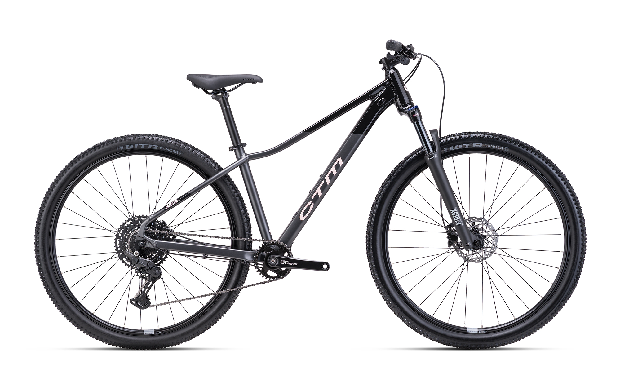 Jízdní kolo CTM CHARISMA 4.0 2025 matná kovová černá / lesklá černá. Kolo je vybaveno rámem ALU 6061, S, M, L a vidlicí Suntour XCM32,NLO,DS ,100mm 29".