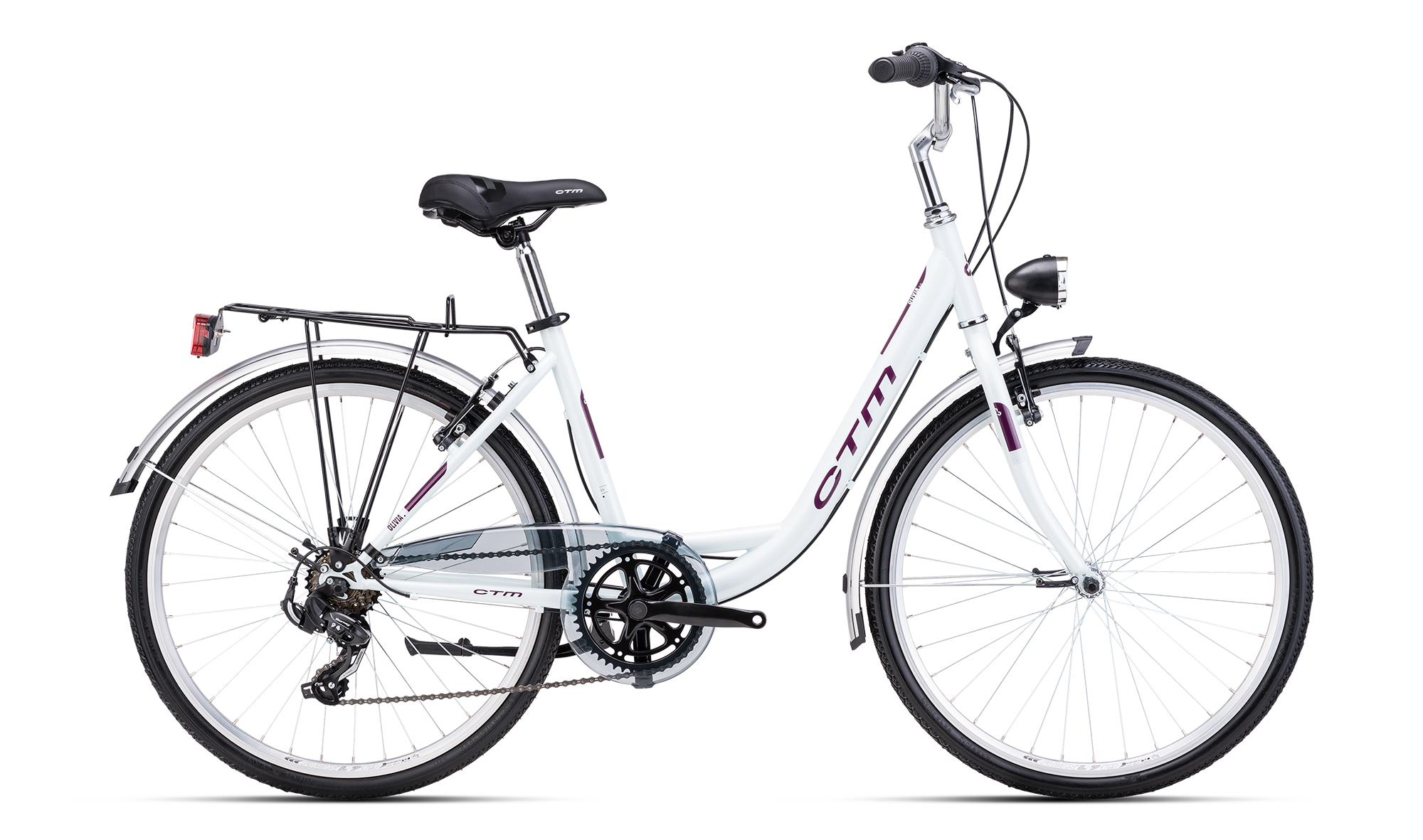 Jízdní kolo CTM OLIVIA 2.0 2025 fialovobílá perleť / tmavá fialová. Kolo je vybaveno rámem Hi Ten, 17 (430mm) a vidlicí Hi ten- unicrown 26".