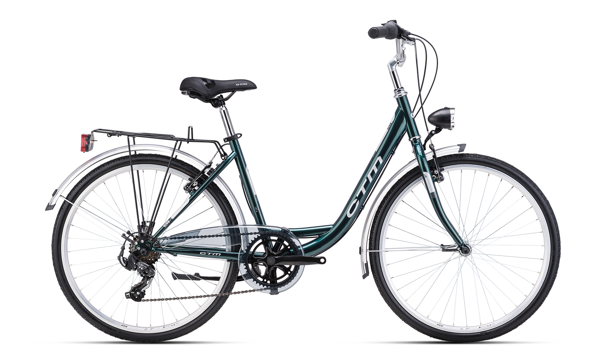 Jízdní kolo CTM OLIVIA 2.0 2025 tmavězelená perleť / stříbrná. Kolo je vybaveno rámem Hi Ten, 17 (430mm) a vidlicí Hi ten- unicrown 26".