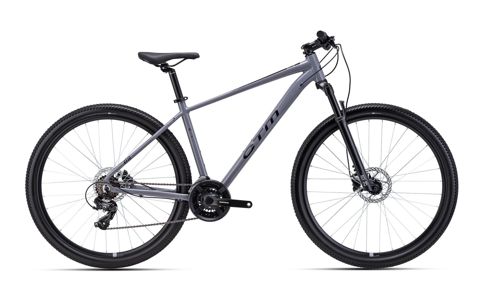 Jízdní kolo CTM REIN 1.0 29" 2026 šedá. Kolo je vybaveno rámem ALU 6061, M, L, XL a vidlicí CTM XCF 100mm travel, 29".
