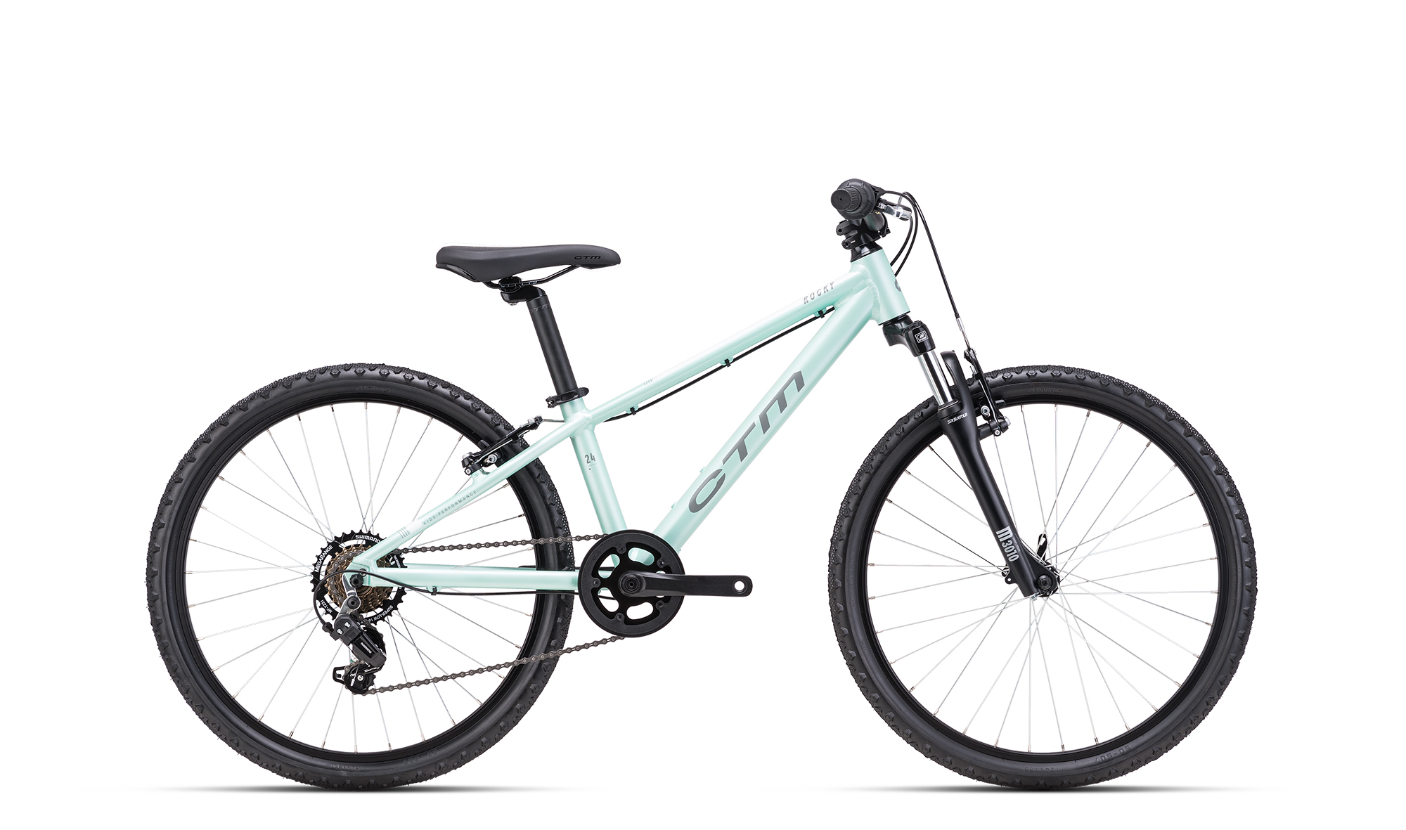 Jízdní kolo CTM ROCKY 2.0 2025 matná tyrkysová perleť / šedá. Kolo je vybaveno rámem ROCKY, AL 6061, 13 a vidlicí Suntour M3010, 24".