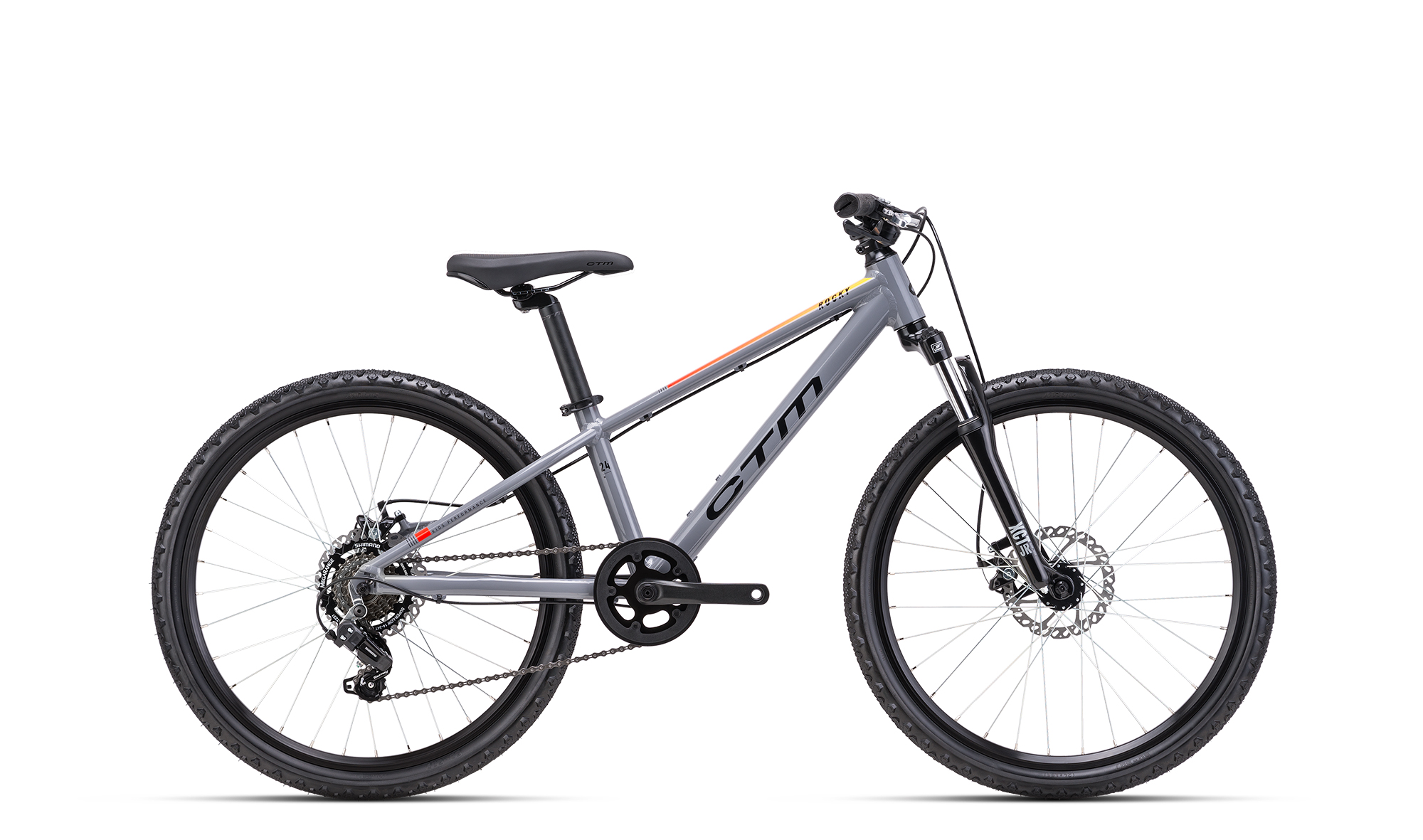 Jízdní kolo CTM ROCKY 3.0 2025 šedá / oranžová. Kolo je vybaveno rámem ROCKY, AL 6061, 13 a vidlicí Suntour XCT-JRDS 50mm 24".