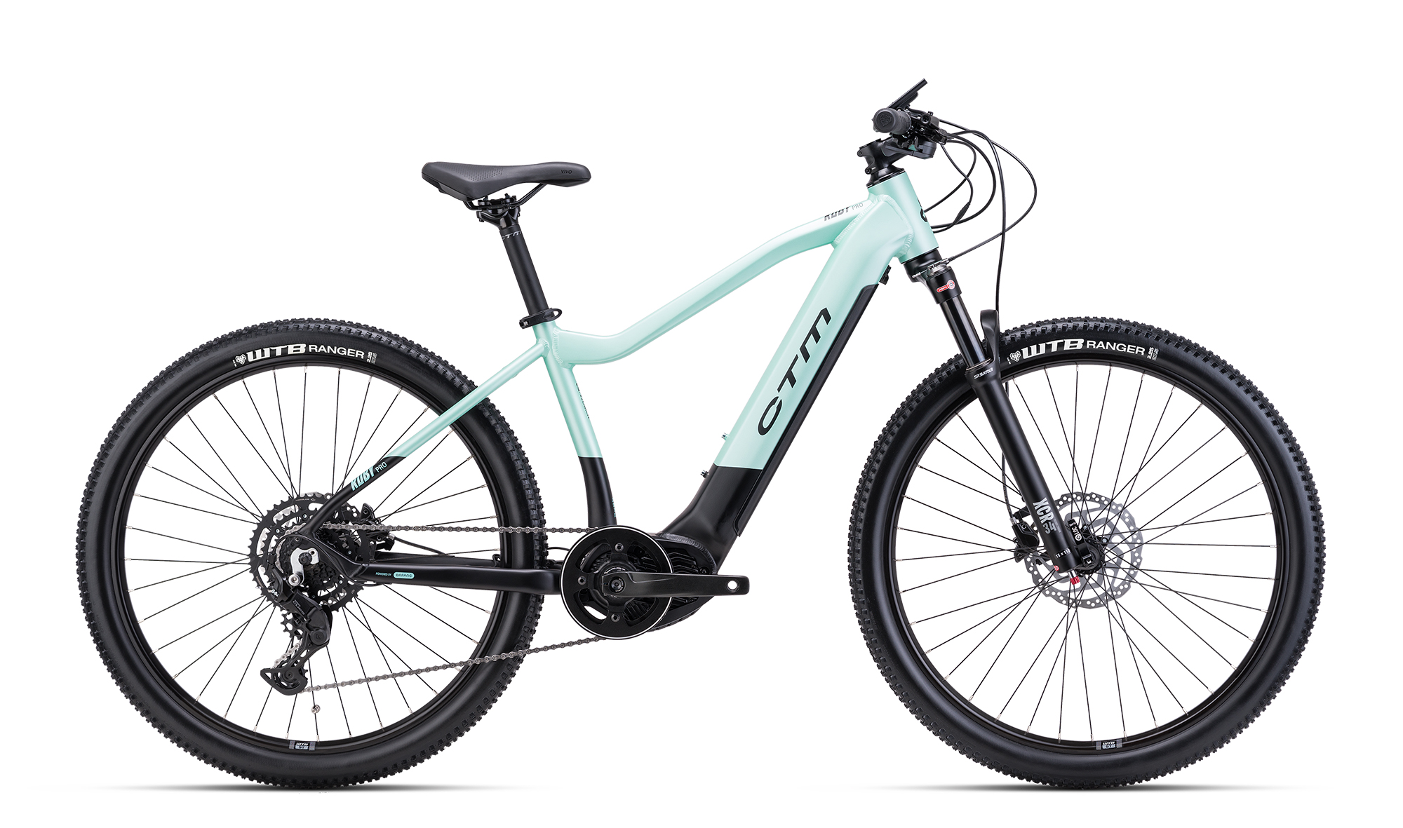 Jízdní kolo CTM RUBY Pro 27,5" 2024 matná černá / tyrkysová perleť. Kolo je vybaveno rámem ALU 6061, S(14"), M (16"), L (18") a vidlicí Suntour XCR34 AIR, RLR, boost™ 15x110axle.
