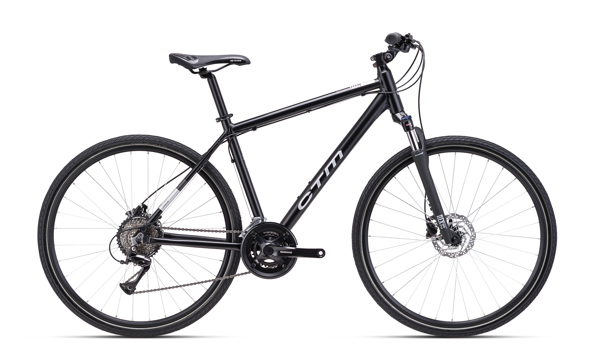 Jízdní kolo CTM TRANZ 2025 matná černá / lesklá stříbrná. Kolo je vybaveno rámem ALU 6061, M, L, XL a vidlicí Suntour XCE28 DS 29".