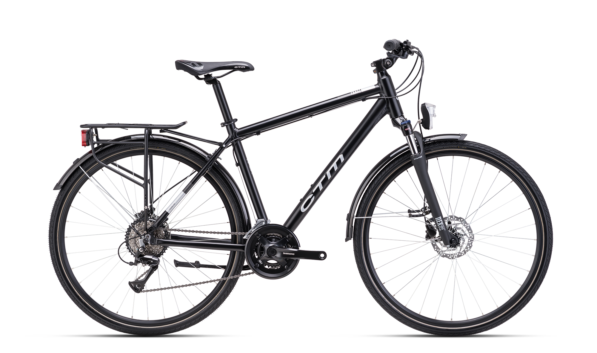 Jízdní kolo CTM TRANZ trek 2025 matná černá / lesklá stříbrná. Kolo je vybaveno rámem ALU 6061, M, L, XL a vidlicí Suntour XCE28 DS 29".