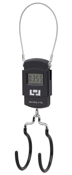 digitální závěsná váha s měřením 20g - 50 kg, pro vážení cyklo komponentů, rámů a kol, tolerance vážení: 20g -10kg = +/- 5g,10kg -50kg = +/- 10g, baterie 2x AAA , nejsou součásti balení