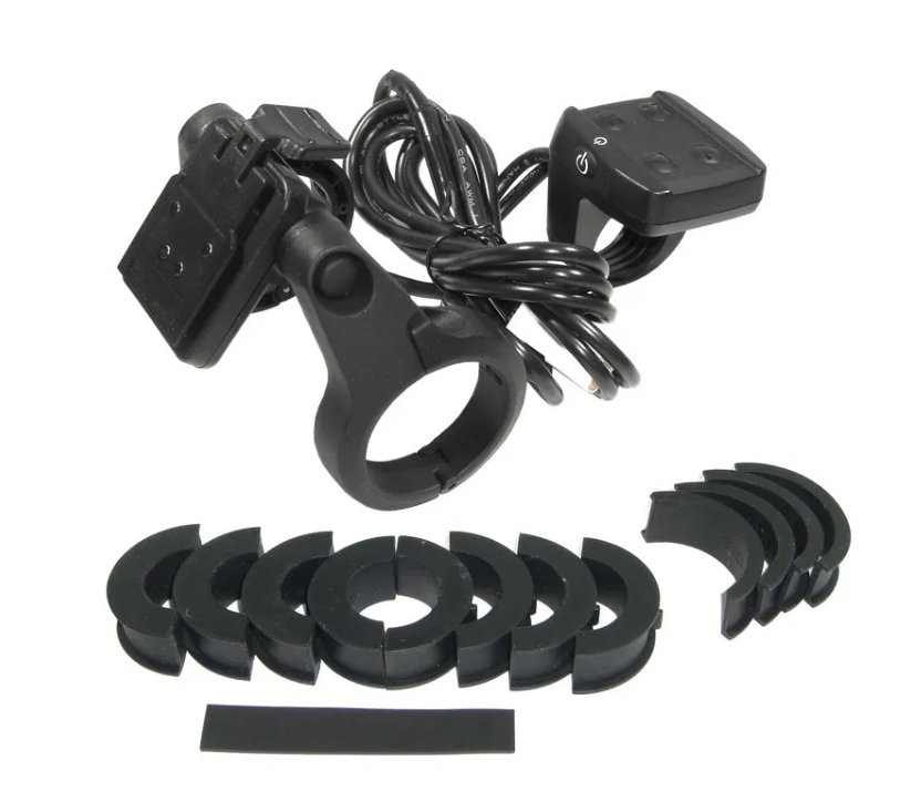 součástí balení:Držák;ovládací jednotka; připojovací kabel motoru; redukční zdířka řidítek