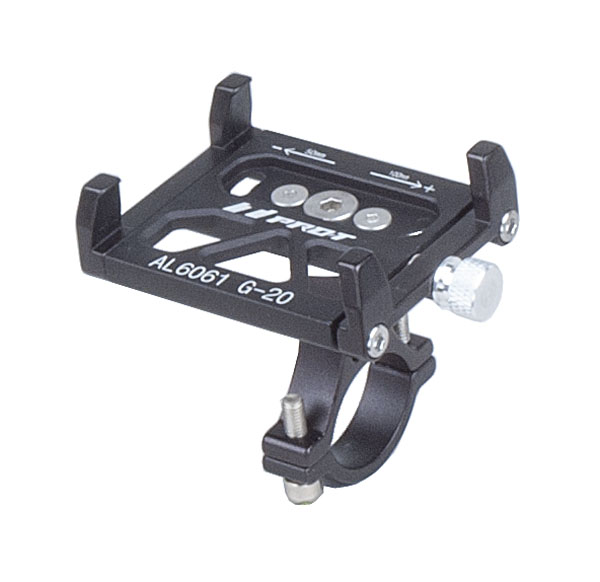materiál AL, pro telefony 3,5"-6,2",rozměr 70x58mm, nastavitelná šířka 50-100mm, hmotnost 110g, montáž na řídítka 31,8mm