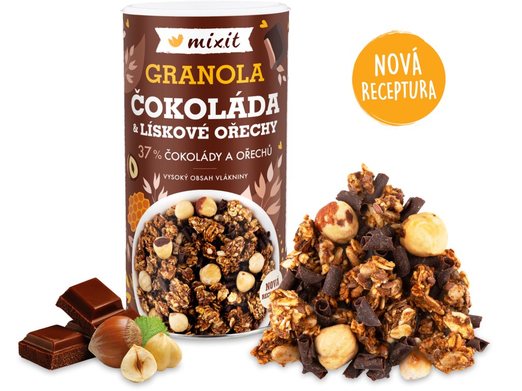 Skvělá, bezkonkurenční a velmi oblíbená, to je čokoládová granola od Mixit! Křupněte si medové kousky dozlatova upečených prémiových ovesných vloček z Finska spolu s lněnými semínky a přepuštěným máslem bez laktózy. Kvalitní hořkou čokoládou jsme nešetřili a celou recepturu korunovali praženými jádry lískových oříšků. Dobrou chuť. :-)