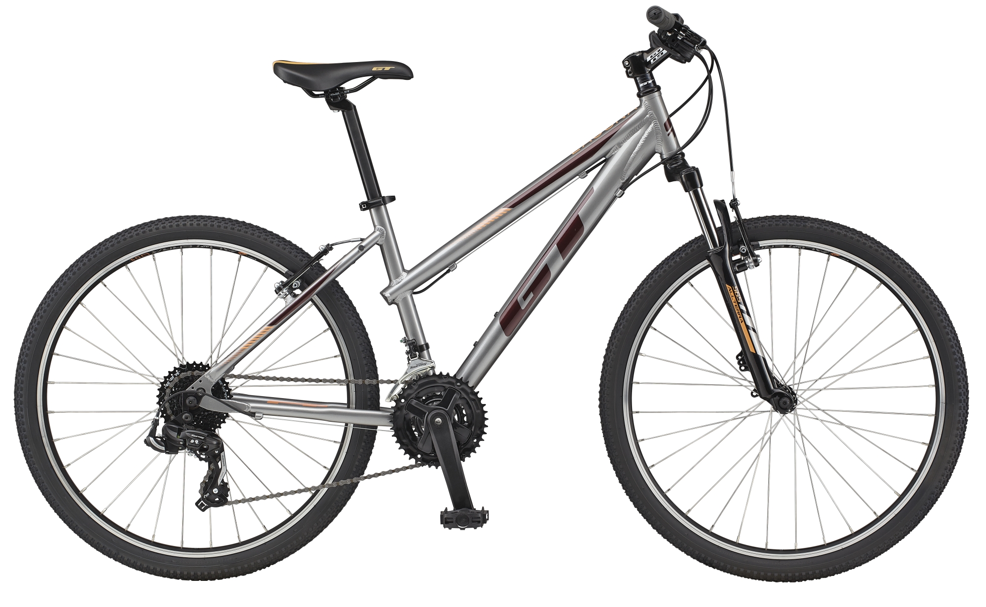 Horské kolo GT LAGUNA 26" (G28151F10/SLV) model 0. Kolo je vybaveno rámem 6061-T6 Aluminum Step Thru Frame, w/ Replaceable Derailleur Hanger and 1 1/8" Head Tube a vidlicí All Terra CH-565, 80mm, Coil.