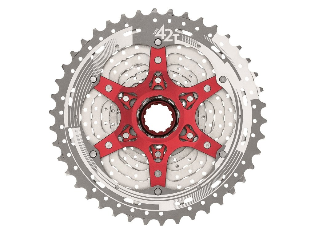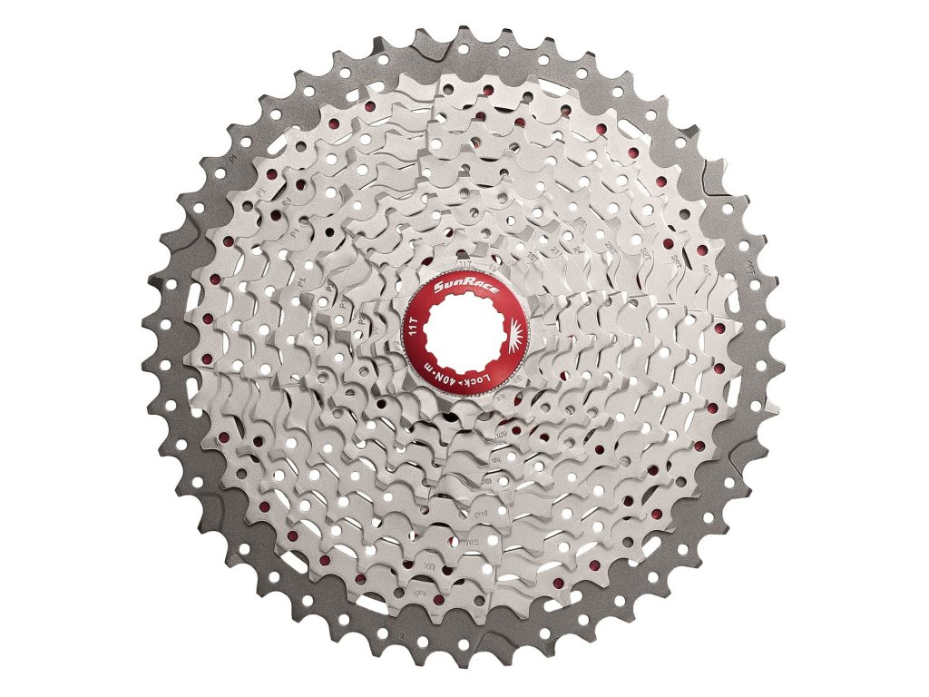 Výrobce: SunRace Model kazety: CSMX8EAY Počet pastorků: 11 (10 ocelových, největší ALU 7075) Rozsah pastorků: 11–13–15–17–19–21–24–28–32–36–42 Hmotnost: 401 g Materiál: ocel, Al Barva: stříbrná