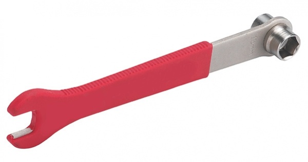 Kombinovaný montážní klíč s madlem na pedály 15mm a k montáži a demontáži nábojů a klik - nástrčka 14–15mm na šrouby v klice, 4mm tloušťka Pogumovaná rukojeť Délka: 230 mm, Materiál: Fe železo o síle 4mm Hmotnost: 206 g Balení: servisní