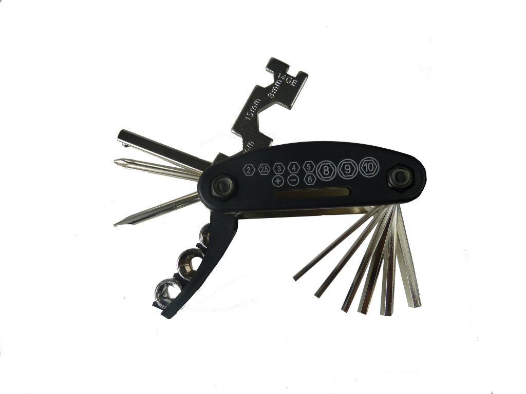 Sada obsahuje: plochý a křížový šroubovák, stranový klíč 8, 10, 15mm, nástrčný klíč (gola) 8, 9, 10, imbusový klíč 2, 2.5, 3, 4, 5, 6, centrklíč k centrování kol