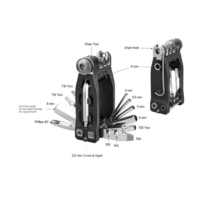 Kompaktní a lehoučké cyklo nářadí s 16 funkcemi včetně nýtovačky. Díky svým rozměrům se toto nářadí pohodlně vejde do kapsy u dresu, podsedlové brašničky nebo do schránky Ninja ToolBox pod košíkem na láhev.