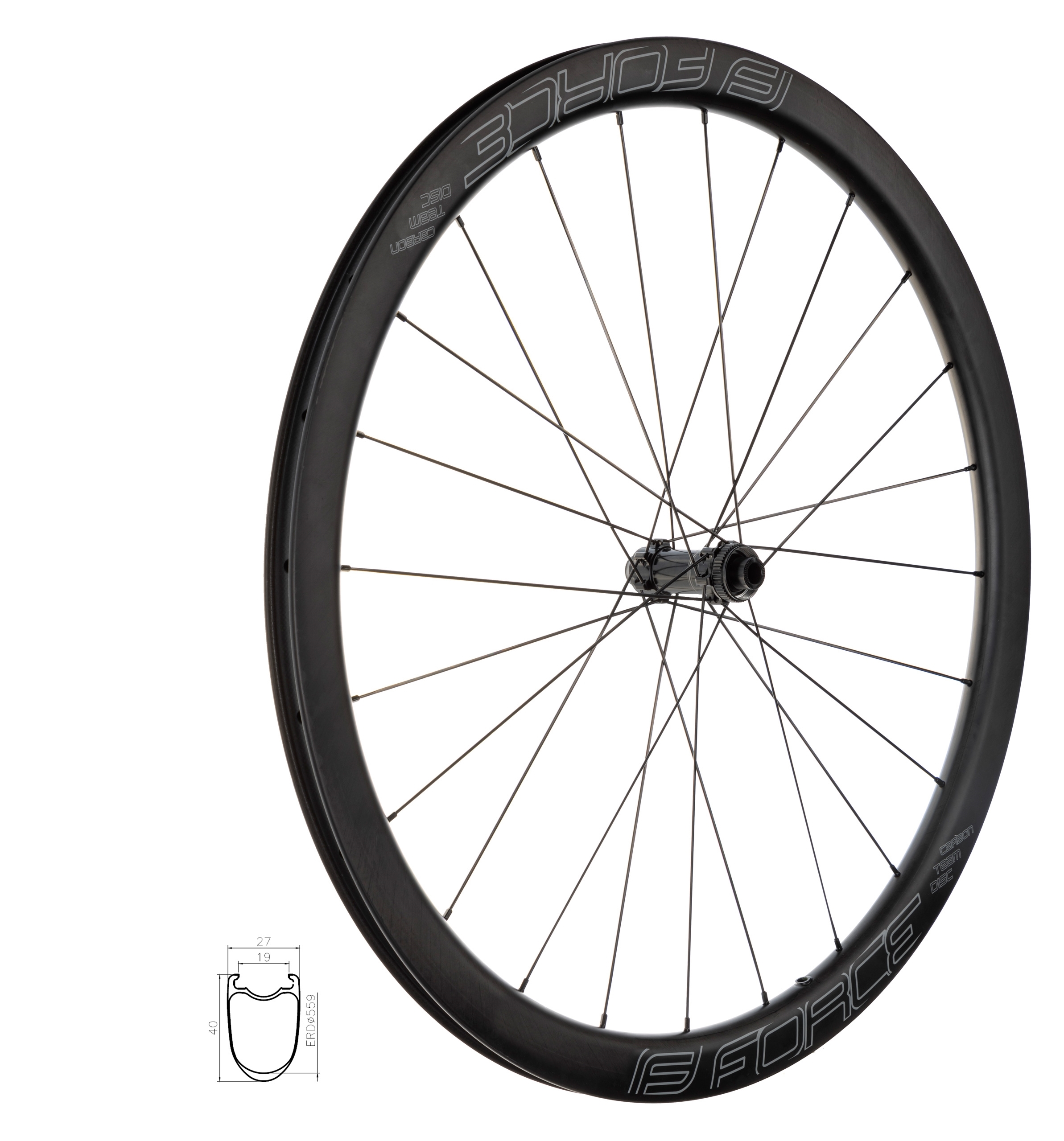 ráfek plášťový FORCE KARBON DISC tubeless ready výška: 40 mm, vnitřní šířka ráfku 19mm, 24 děr Al náboj FORCE TEAM ROAD DISC SP černý osa: 12 x 100 mm dráty DT Aero comp straight pull včetně náhradních drátů maximální doporučená hmotnost jezdce: 100 kg maximální tlak pláště 125 Psi hmotnost: 685 g