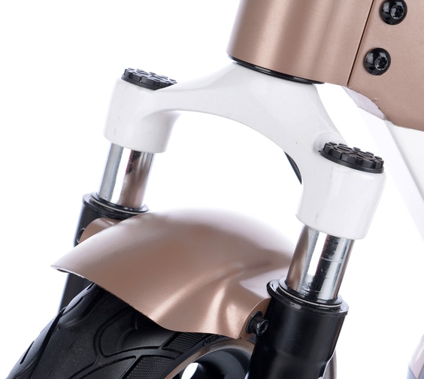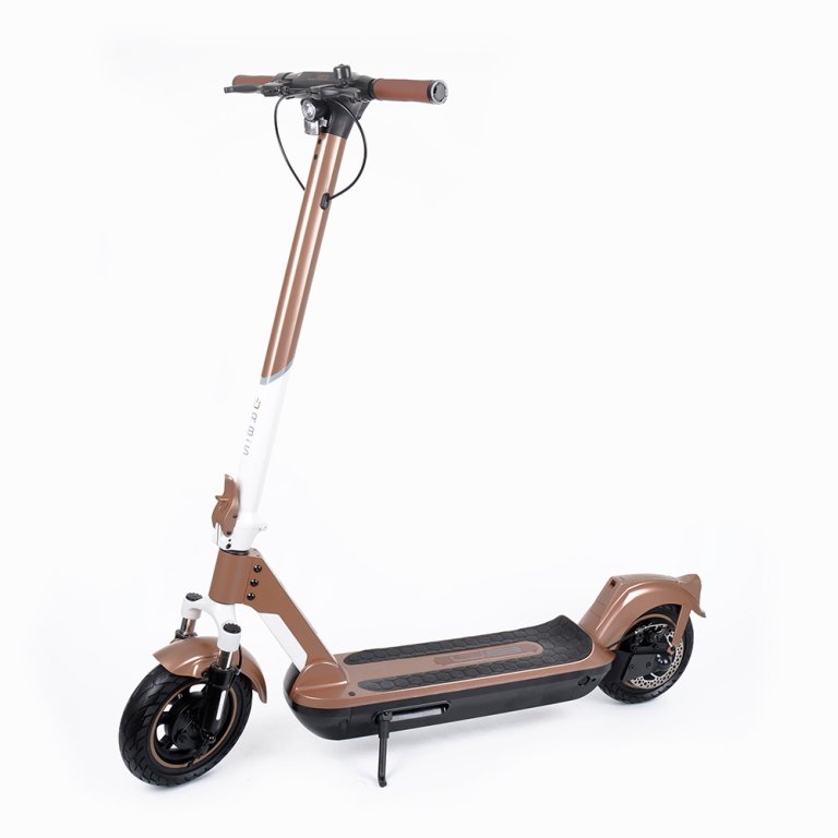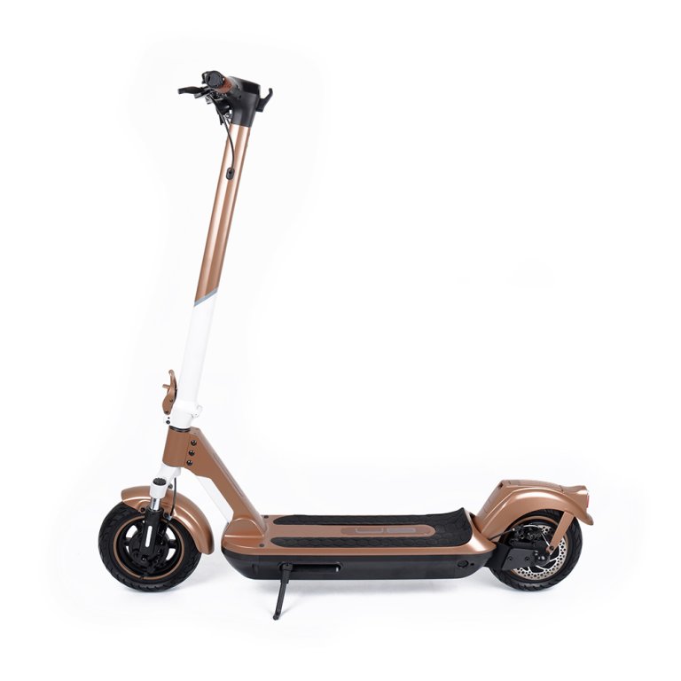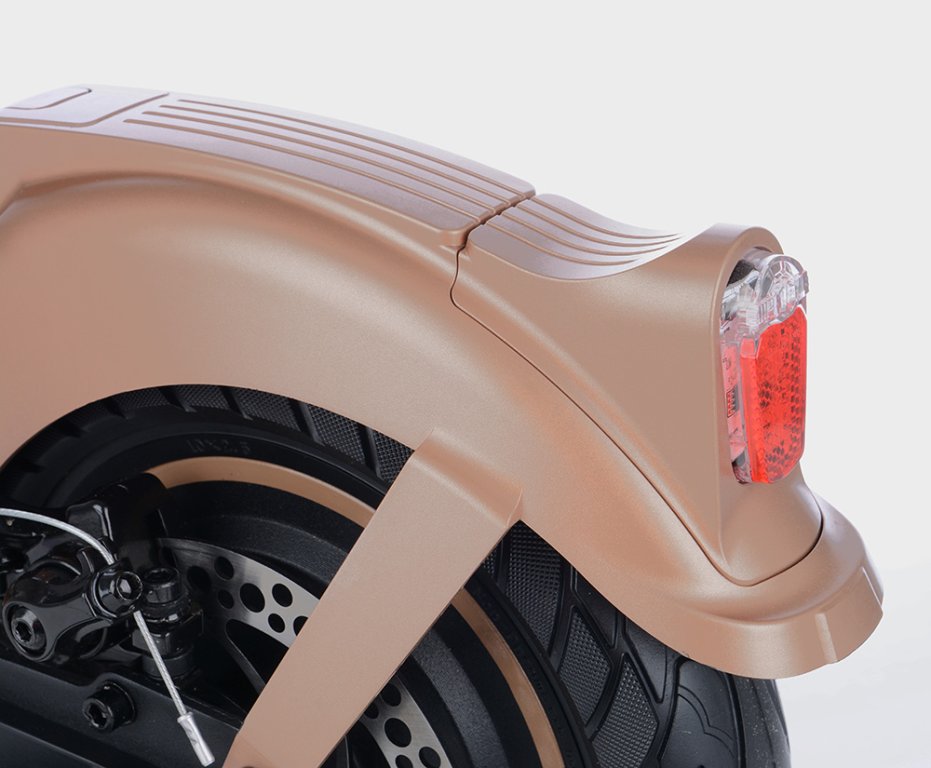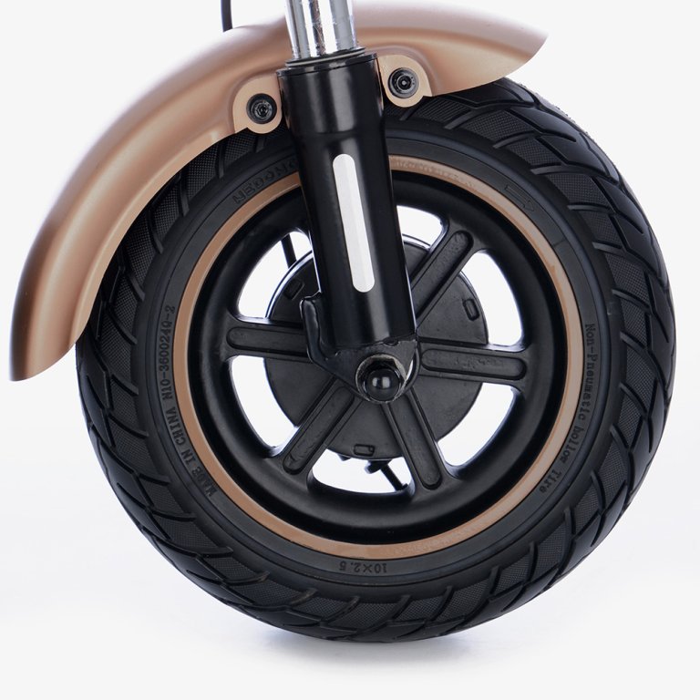 Bezstarostnou jízdu zajišťují 10x2,5“ bezdušové pneumatiky, které nikdy nepropíchnete a překonávání překážek je snadnější díky jejich velkému průměru. Stabilitě na vozovce pomáhá i větší šířka pneumatiky. Přední i zadní vidlice jsou odpružené pro pohodlnou jízdu i po nerovném povrchu. Zadní blatník je vyztužen pro eliminaci únavového zlomu a nepříjemného zvuku při přejíždění nerovností.