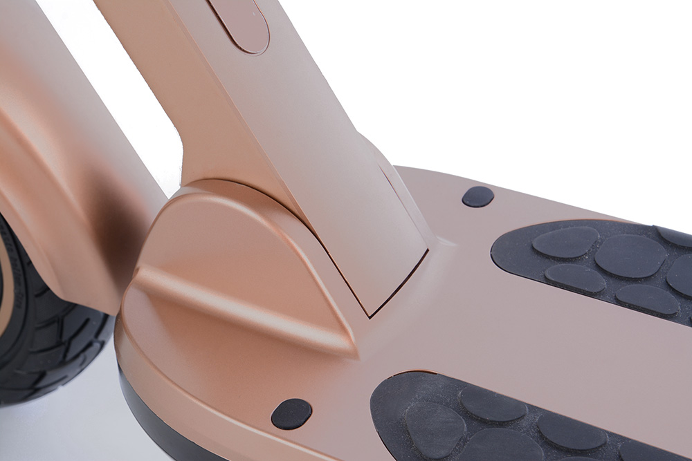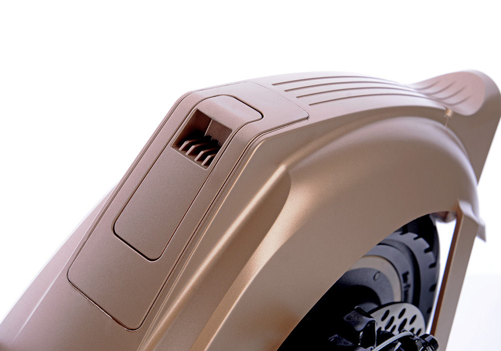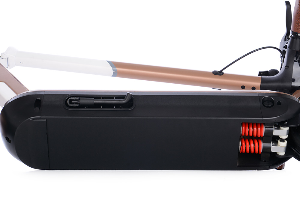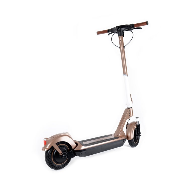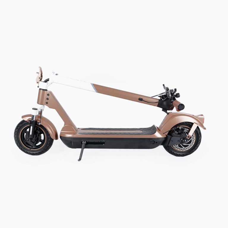 Bezstarostnou jízdu zajišťují 10x2,5“ bezdušové pneumatiky, které nikdy nepropíchnete a překonávání překážek je snadnější díky jejich velkému průměru. Stabilitě na vozovce pomáhá i větší šířka pneumatiky. Přední i zadní vidlice jsou odpružené pro pohodlnou jízdu i po nerovném povrchu. Zadní blatník je vyztužen pro eliminaci únavového zlomu a nepříjemného zvuku při přejíždění nerovností.
