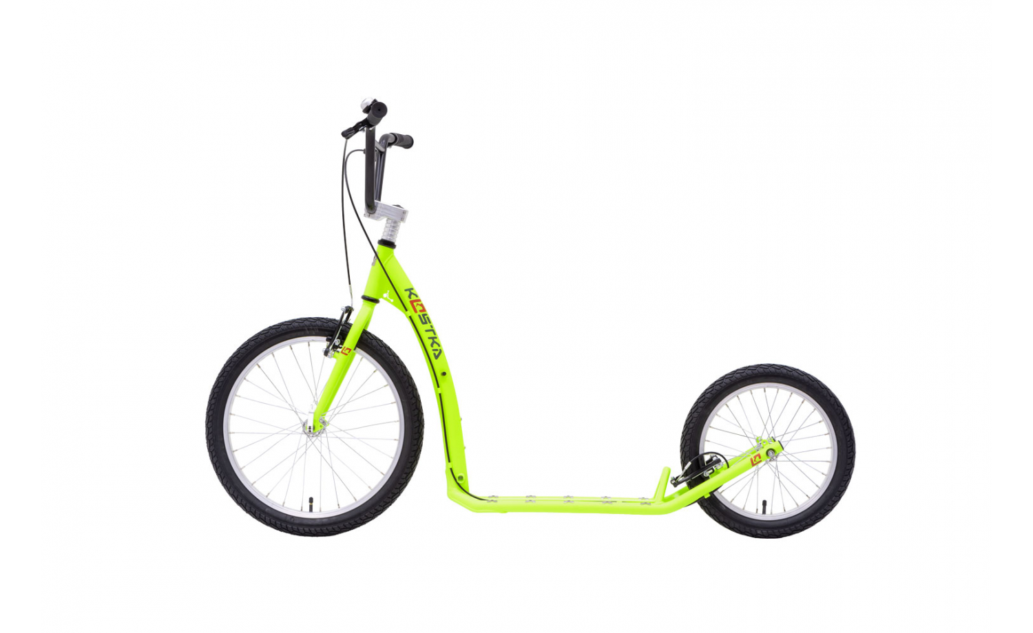 Koloběžka pro začátečníky Za málo peněz hodně muziky... Pokud s koloběhem teprve začínáte a nechcete do nového stroje investovat majlant, KOSTKA HILL FUN, koloběžka do 100 kg, je pro vás výbornou volbou. Aby nedošlo k mýlce... Tato koloběžka pro dospívající děti a dospělé je cenově přijatelná, přesto dotažená do posledního detailu. Stejně jako v případě všech ostatních koloběžek KOSTKA jsme si při její výrobě dali záležet, proto se vyznačuje precizním dílenským zpracováním. Koloběžka KOSTKA HILL FUN svou výbavou plně odpovídá požadavkům začínajícího koloběžkáře a její jízdní vlastnosti vás velmi mile překvapí. Vše začíná u vyladěné geometrie rámu, která zaručuje pohodovou a ničím nerušenou jízdu. Na jednokomorových ráfcích, obutých do plášťů Kenda, si doslova ujedete a véčkové brzdy Promax vás zase bez problémů zastaví. V případě, že budete koloběžku například převážet autem, jistě oceníte hliníkové náboje s rychloupínáky, díky nimž lze kola koloběžky snadno odmontovat a zmenšit tak její rozměry. Garantujeme, že vás levná koloběžka KOSTKA HILL FUN ani přes svou poměrně nízkou cenu nezklame. Proto nečekejte a odrazte se vstříc lásce ke koloběhu. Věříme, že pohled na svět z nášlapu koloběžky vám v mžiku a navždy přiroste k srdci.
