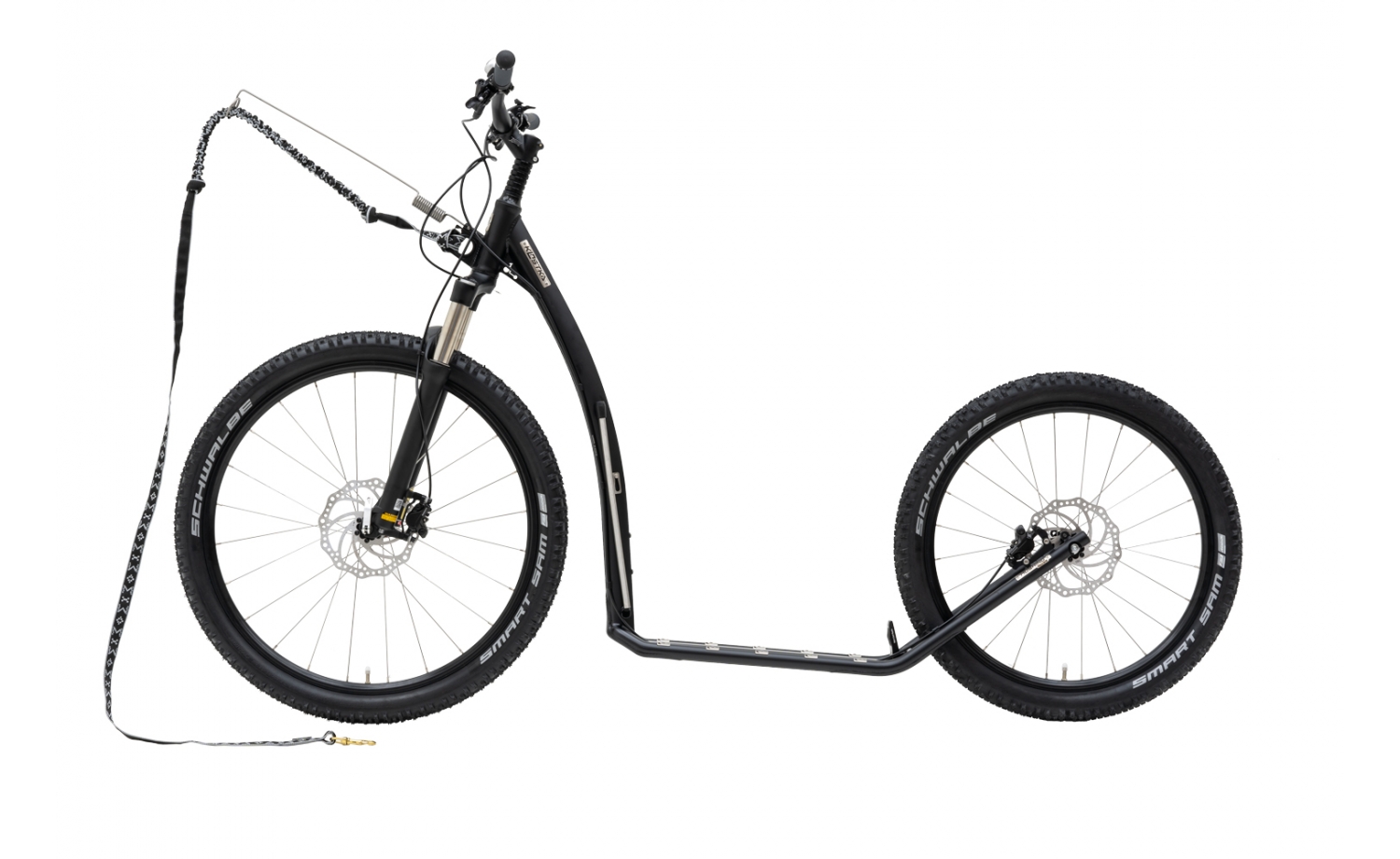 Není žádným tajemstvím, že mnoho psů má doslova závislost na pohybu. Nejšťastnější jsou, když mohou trávit spoustu času běháním a dalšími aktivitami. Jak to skloubit dohromady se psím pánem či paničkou, který má závislost na koloběžce? Mushing – to je správné slovo! Můžete si být jisti, že nová koloběžka Kostka Mushing Racer Pro (G6) spolehlivě zajistí vyplavování adrenalinu do krve jak u vás, tak i u vašeho zvířecího přítele. Podporujeme závislost na pohybu nejen u vás, ale i u vašich psů. Koloběžky s odpruženou přední vidlicí, vybavené vodítkem pro psa, vyrábíme už dlouho. Nový model Kostka Mushing Racer Pro (G6) však posouvá zážitek z jízdy v terénu ještě o level výše. Protože velká kola rychleji jedou, a zároveň mají lepší průchodnost terénem, osadili jsme tento model vpředu 27,5" a vzadu 24" kolem. Překážky, které jste doposud přejížděli obezřetně a pomaleji, nyní „dáte“ v plné rychlosti. Podle charakteru jízdního povrchu jednoduše zvolíte optimální tlak v terénních pláštích Schwalbe Smart Sam, které se vám odmění skvělou trakcí v synergii s nízkým valivým odporem. Hydraulické kotoučové brzdy Shimano Deore pak zajistí bezpečné brzdění či zastavení i v nejnáročnějších podmínkách. Doslova vás podrží jak na suchém, tak i v bahnitém nebo rozmáčeném terénu. Přední vzduchová vidlice se zdvihem 100 mm je vybavená zamykáním pružení na řídítkách – při odrážení tak nepřijdete o cennou energii. Vidlice je uložená v semi-integrovaném hlavovém složení, které výrazně zvyšuje tuhost celého kompletu přední vidlice/rám koloběžky a přináší také přesnější odezvu řízení. Citelně byla zvýšena tuhost také u rámu šesté generace. Nášlapná plocha dostala nový středový profil, CNC frézovaný doraz paty je pak nejen vysoce funkčním, ale také designovým prvkem této koloběžky. Kontrolu nad svým strojem máte ve svých rukou, ovládajících 720 mm široké „vlaštovky“ – lehká oversized řídítka, opatřená gumovými gripy s pojistnými objímkami proti samovolnému pootáčení, které se výborně drží i v rukavicích. Krátký představec zvyšuje celkovou tuhost řízení a přispívá k jeho přesnosti. Standardní výbavou musherské koloběžky Kostka Mushing Racer Pro (G6) je samozřejmě také držák pro vodítka psa, integrovaný na hlavové trubce pod řídítky. S koloběžkou se dodává jednoduše odnímatelný adaptér vodítka z pružinové oceli, plus vodítko s amortizérem. Vodítko splňuje normy, předepsané českými i mezinárodními svazy – díky tomu můžete hned po vybalení nového stroje z krabice vyrazit se svým psím tahounem na musherské závody. Přejeme vám spoustu zážitků z jízdy! A když navrch získáte i nějaké ty medaile, bude to největším oceněním naší práce.