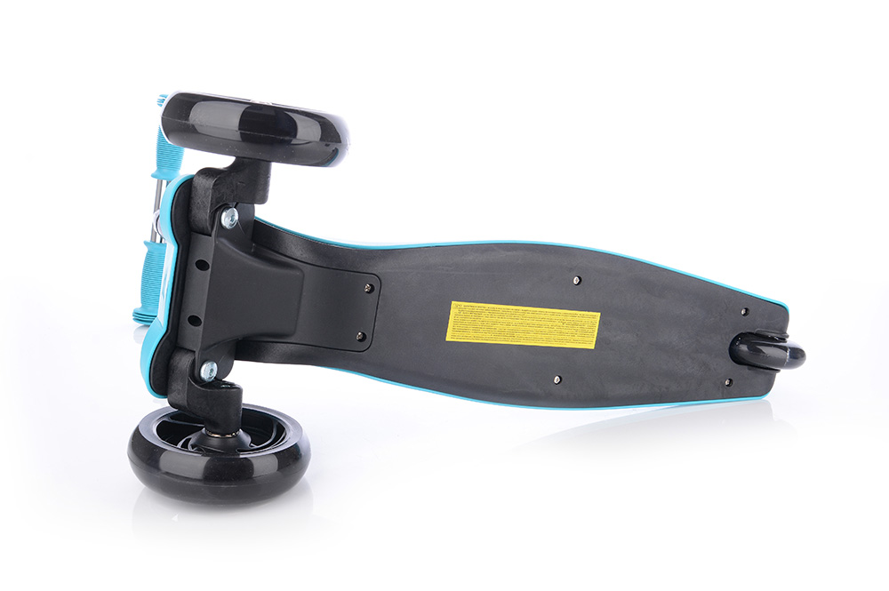 Bezpečná koloběžka pro děti od 3 let. Velmi jednoduchý skládací systém na 1 tlačítko. Nastavitelná výška řídítek ve 4 polohách: 56 cm, 61 cm, 66 cm, 71cm. Koloběžka je velmi stabilní kvůli použití 3 koleček. Velmi jednoduchá na ovládání – přenášení váhy na stranu, čímž koloběžka zatáčí. Deska má užitnou plochu 29 x 12 cm. Přední i zadní kolečka jsou osvětlena LED multicolor světly.