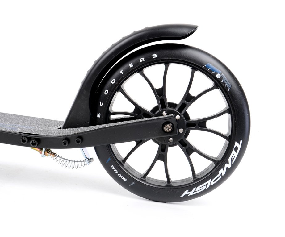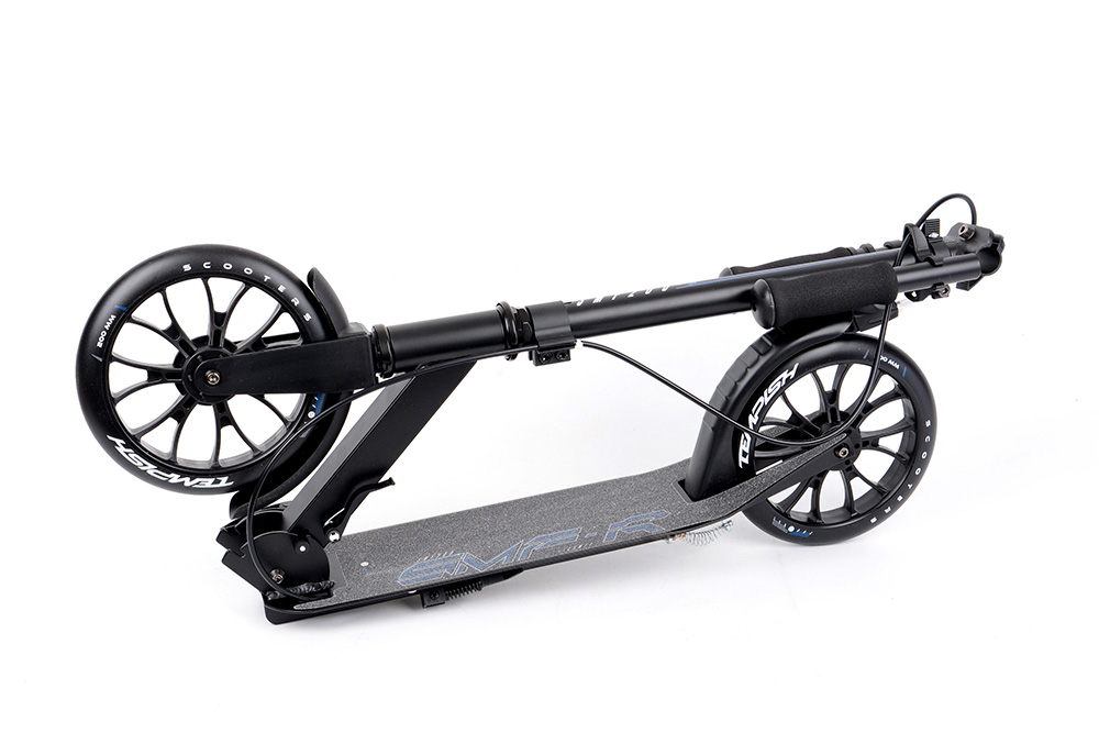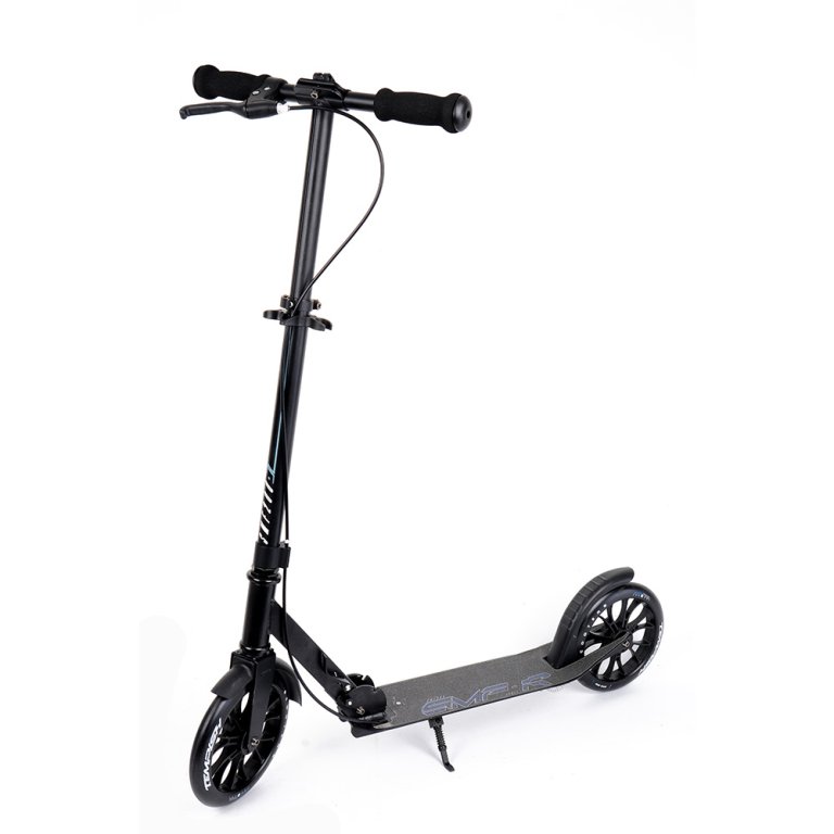 Skládací koloběžka TEMPISH SMF 200 R s ruční brzdou. Zadní kolo je brzděno brzdou, která se ovládá pravou rukou na řídítkách. Pohodlný sklápěcí systém. Rukojeti jsou zajištěny velmi pevně velkou svorkou přímo na tyči řízení. Na rukojetích jsou pěnové gripy. Řídítka je možno výškově nastavit a zajistit rychlospojkou. Základní nášlapná deska je snížená pro pohodlné odrážení a delší odraz. Koloběžku lze také přibržďovat pevným blatníkem/brzdou zadního kola. Pro odstavení je koloběžka vybavena sklápěcím stojánkem.