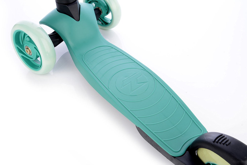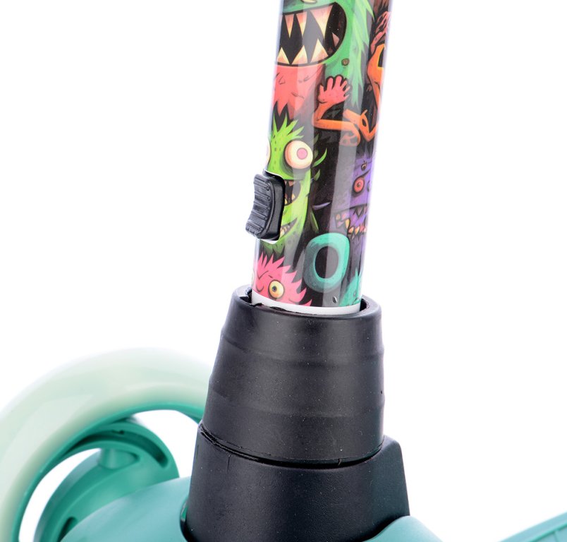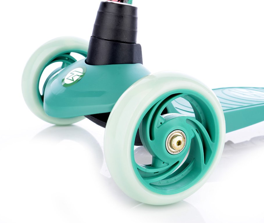 Bezpečná skládací koloběžka se zvýšenou stabilitou pro začínající sportovce. Přední náprava se natáčí klasicky jako u běžných koloběžek, nikoli přenášením váhy jezdce na stranu. Koloběžka má omezení maximálního úhlu vytočení.