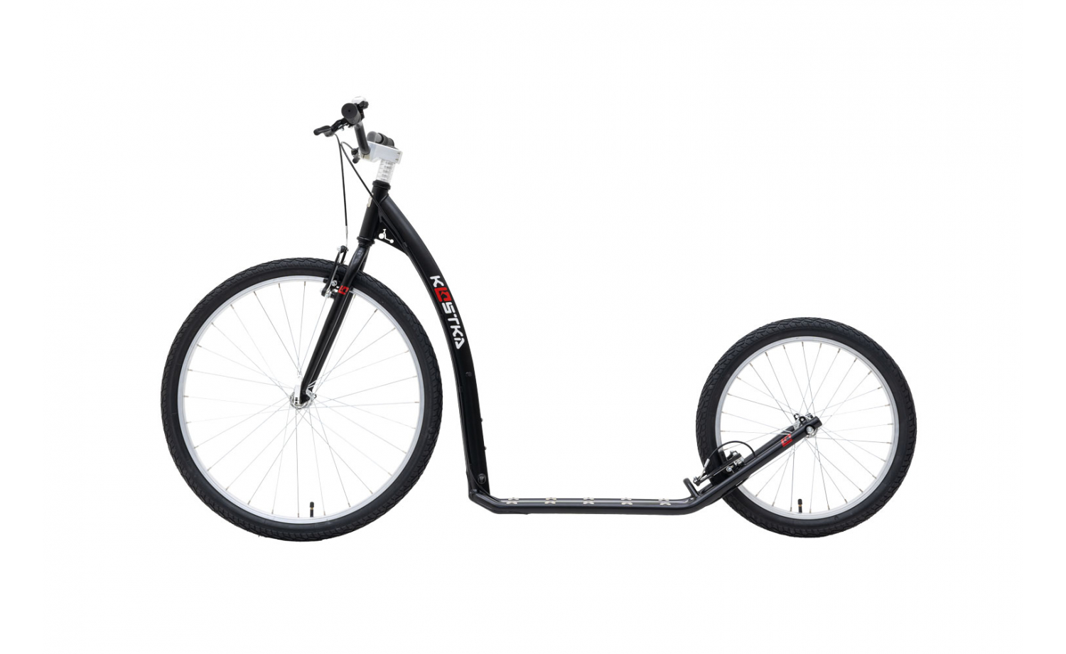 Koloběžka s velkými koly, pro začátečníky Pokud s koloběhem teprve začínáte, a nejste si proto úplně jisti, zda vás tento sport chytne a nepustí (věříme, že ano), je koloběžka KOSTKA TOUR FUN správná volba. Na to, jaké možnosti nabízí, je totiž poměrně levnou koloběžkou pro dospělé. Jsme si 100% jistí, že od ní dostanete přesně to, co jakožto začínající koloběžkách potřebujete. Její konfigurace totiž rozhodně není nijak ošizená. Koloběžka TOUR FUN stojí na velmi kvalitním rámu, který je optimalizován pro příjemnou a pohodovou jízdu. Pohoda, klídek, koloběh, to je oč tu koloběží... Podobně jsou na tom jednokomorové ráfky, nazuté do plášťů Mitas, na kterých si zkrátka a dobře ujedete. Ale abyste si neujeli zase až moc, můžete kdykoliv zpomalit za pomocí účinných véčkových brzd Promax. Nášlap této koloběžky s velkými koly 26"/20" je ze spodní strany opatřen výztuhou a speciálními sváry, které zpevňují rám a zároveň chrání jeho nejvíce namáhaná místa při styku s nerovnostmi. Až budete chtít koloběžce ukázat vzdálenější destinace, jistě oceníte, že náboje kol disponují rychloupínacím systémem upevnění osy. Díky tomu je možné kola snadno a rychle odmontovat, a váš stroj tak snáze naložit do kufru automobilu. Jak jsme slíbili na začátku, koloběžka pro dospělé KOSTKA TOUR FUN je zkrátka výborný stroj za přijatelnou cenu, který do puntíku splní vaše očekávání. Odrazte se vstříc objevování krás koloběhu a světa, jenž nás obklopuje. Určitě této vášni zcela podlehnete.