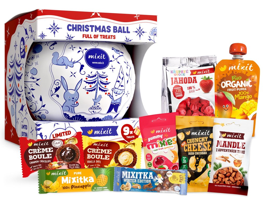 Vánoční koule plná dobrot není jen nejorinálnější ozdoba na stromeček – je to poklad plný nejoblíbenějších Mixit dobrot! Uvnitř najdete křupavý irský cheddar, 100% mangovou BIO kapsičku, Křupavou jahodu a další bestsellery. Každá koule obsahuje celkem 9 pečlivě vybraných dobrot tak, aby potěšila malé i velké mlsouny. Ideální jako vánoční dárek nebo jako společné mlsání dobrot během adventu.