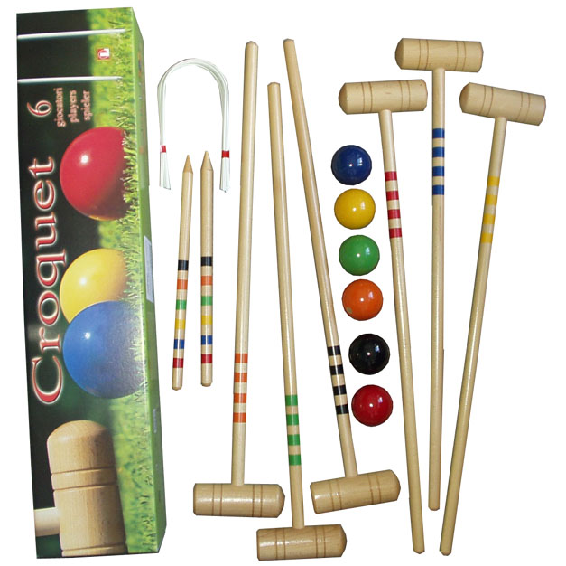 Kroket - sada pro 6 hráčů v papírové krabici - palice, koule, branky. Délka palic je 80cm, průměr spodního válce palice je 5,5cm, průměr koule je 7cm. Kvalitní opracování, lakovaný povrch holí. Vyrobeno v Itálii.