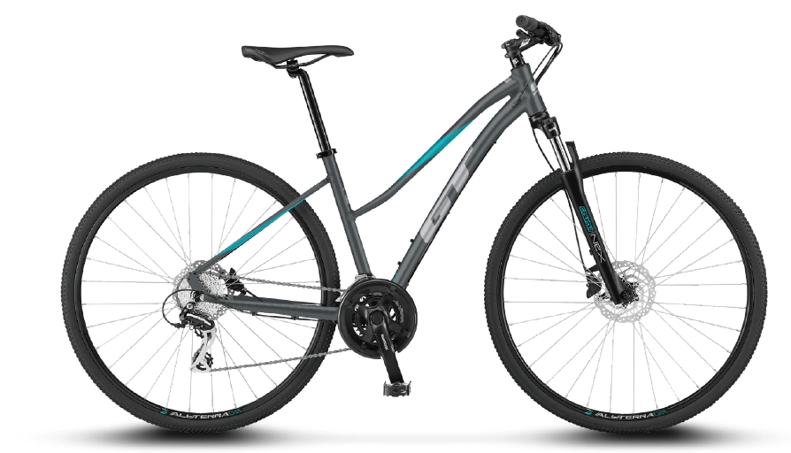Krosové kolo GT TRANSEO COMP WOMENS (G32201U10/GRY) model 0. Kolo je vybaveno rámem 6061 T6 Aluminum Frame, Triple Triangle w/ Floating Seat Stays, Forged Drop-outs w/ Chainstay Disc Brake Mounts, 1 1/8" Integrated Head Tube a vidlicí SR Suntour NEX-DS, 65mm, Coil.