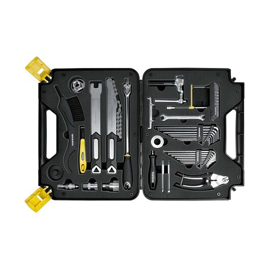 Sada nářadí na kolo v praktickém kufříku. Celkem 36 kusů profesionálního cyklistického nářadí se vejde do tohoto úhledného boxu. Součástí je taktéž přídavná taška na další kousky nářadí. Prepbox je skvělý pro práci v dílně, na různých akcích nebo u vás doma. Nýtovačka řetězů je kompatibilní s jedno a vícerychlostními řetězy (do 12 rychlostních) včetně 11 rychlostních řetězů Campagnolo hollow pin.