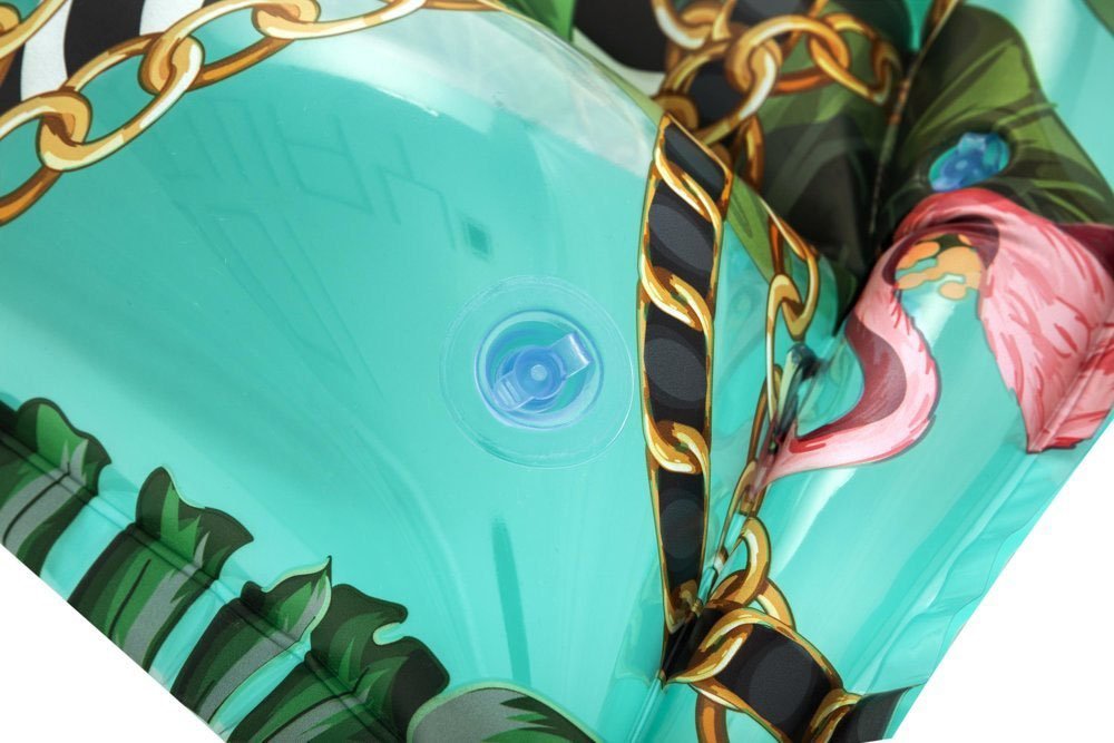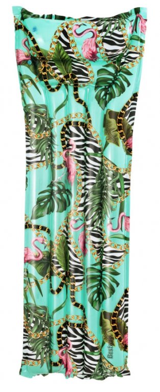 Nafukovací lehátko s líbivým potiskem exotickými motivy. Lehátko má nafukovací polštář a pět nafukovacích komor na ležení se samostatným ventilem. Rozměr lehátka je 183 x 69 cm. Lehátko má zesílené stěny nafukovacích komor pro větší odolnost. Stejně je ale potřeba s lehátkem opatrně zacházet. Lehátko je i tak náchylné k poškození. Před použitím lehátka je třeba plochu na ležení (pokud se nejedná o hladkou dlažbu nabo nějaký měkký podklad) napřed zbavit ostrých kamínků, větviček a dalších předmětů, které by mohly způsobit poškození lehátka. Součástí lehátka jsou samolepící záplaty na případné opravy.
