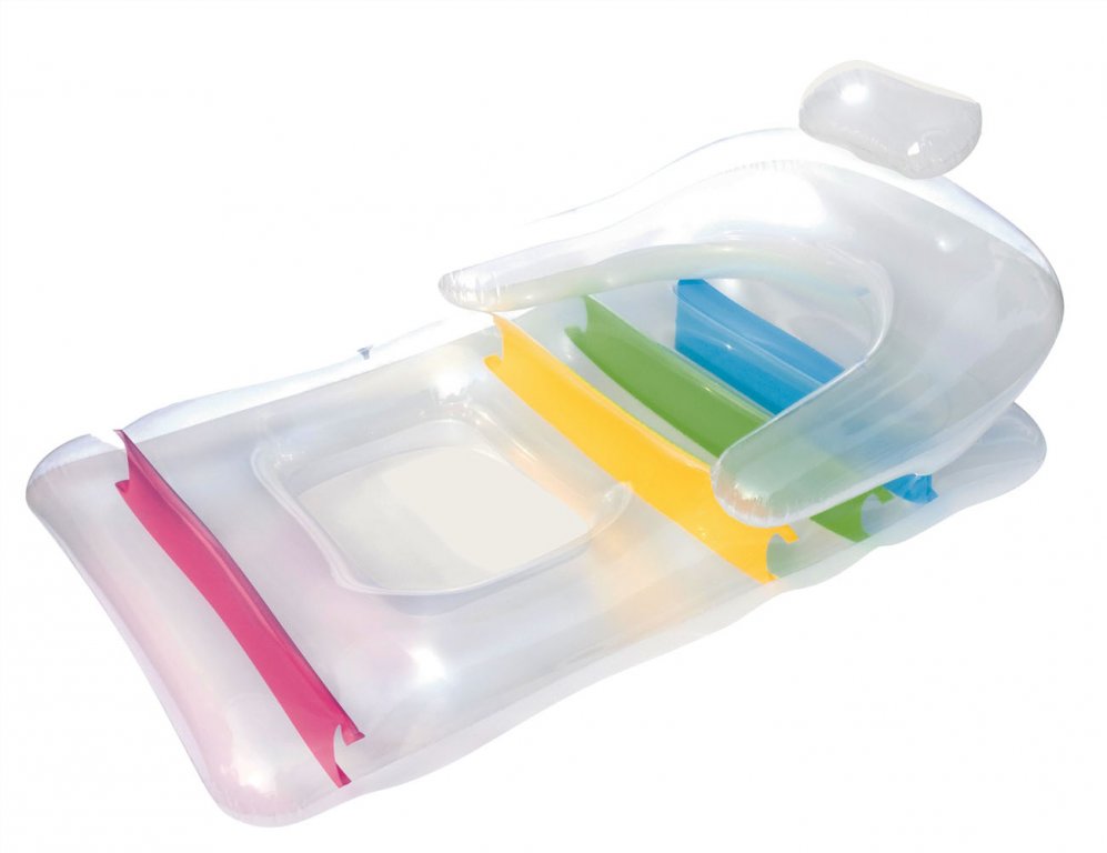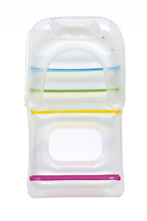 Nafukovací lehátko KOOL LOUNGE je multifunkční křeslo s průhledem do vody, které poskytuje výjimečné pohodlí díky opěrce hlavy, podpěrám zad a loktů. Ve vyfouknutém stavu má rozměry 165 x 89 cm a je vybaveno dvěma nafukovacími komorami. Jeho konstrukce umožňuje skládání z lehátka na křeslo. Lehátko má nosnost 90 kg a je vyrobeno z vinylu. Design je transparentní s barevnými výztuhami uvnitř lehátka pro estetický vzhled. Upozornění: Před použitím se doporučuje zkontrolovat podklad, aby byl zbaven ostrých předmětů jako jsou kamínky nebo větvičky, které by mohly lehátko poškodit.