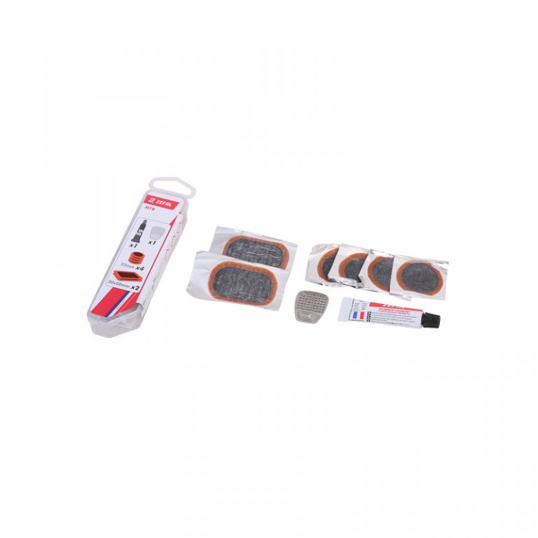 Lepení MTB obsahuje 6 záplat (4 x Ø 33 mm, 2 x 30*50 mm) / 1 lepidlo 5 g / 1 ocelovou škrabku