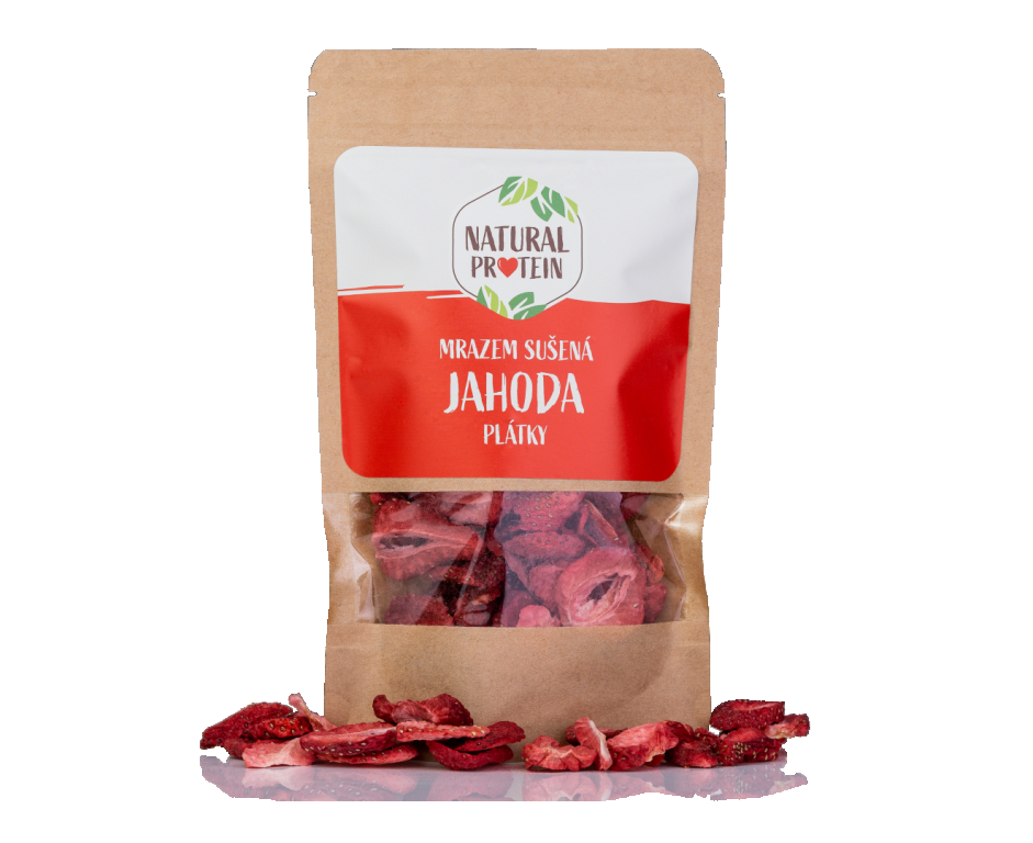 Vyzkoušejte plátky mrazem sušených jahod a objevte novou dimenzi zdravého mlsání ? Mrazem sušené jahody si zachovávají až 95% vitamínů a minerálů oproti jahodám čerstvým. Jsou bohatým zdrojem vitamínu C a díky vysokému obsahu vlákniny a nízkému glykemickému indexu je mohou jíst i diabetici. Sušení mrazem, tedy lyofilizace, zbaví jahody vody a ty jsou tak úžasně křupavé.
