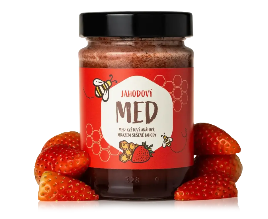 Milujete med? A milujete jahody? Tak tohle bude tutově vaše nová závislost. Jemný akátový med s jasmínovou vůní, který je jeden z vůbec nejsladších, jsme vylepšili hrstkou najemno drcených mrazem sušených jahod. Med má díky tomu nejen parádní červenou barvu, ale hlavně šťavnatou ovocnou chuť, kterou nejvíc oceníte jen tak na lžičce, na chlebíku, ve snídaňové kaši, jogurtu nebo třeba čaji. Bez přidaných stabilizátorů, cukerných sirupů a jiných přísad. Jen kvalitní med a jahody.